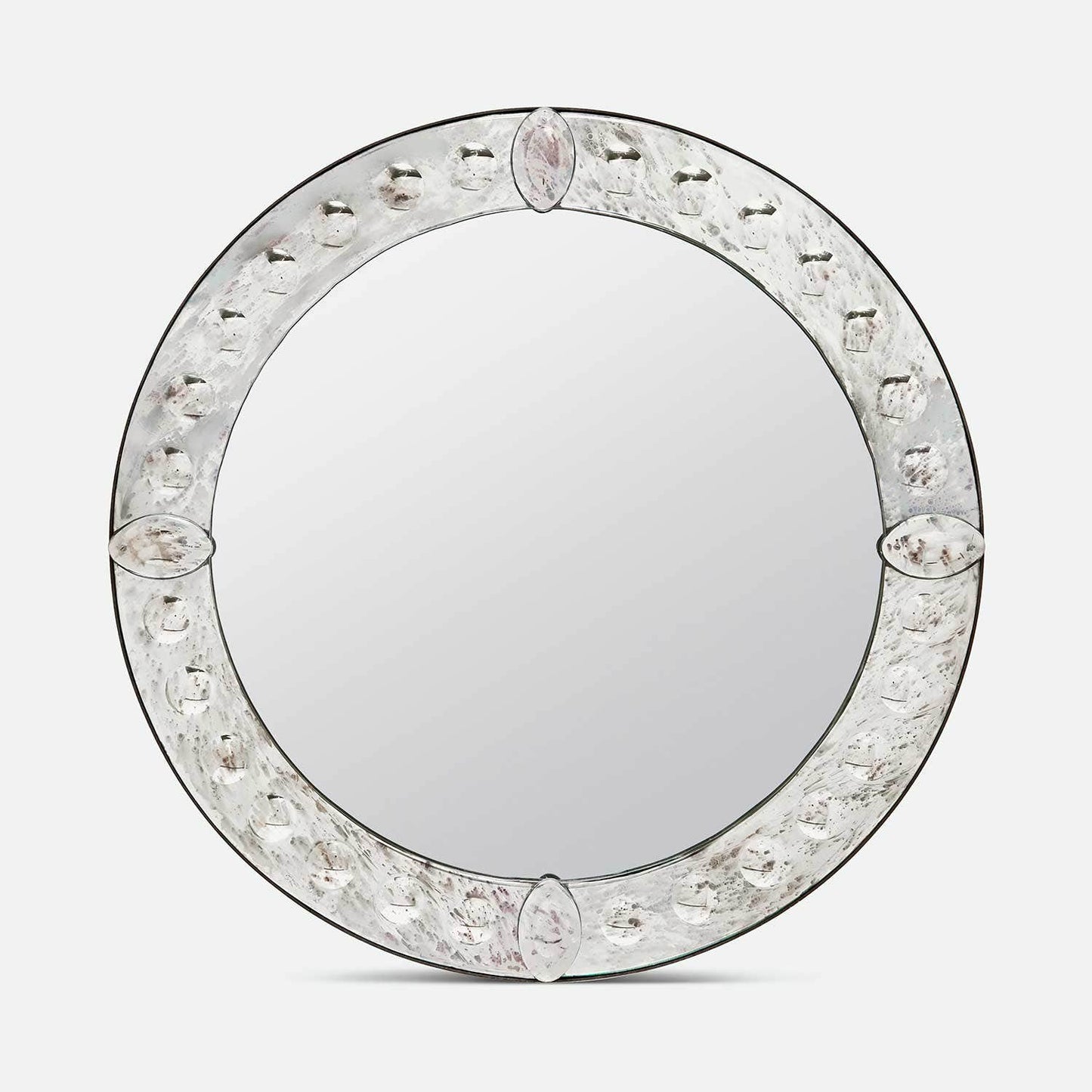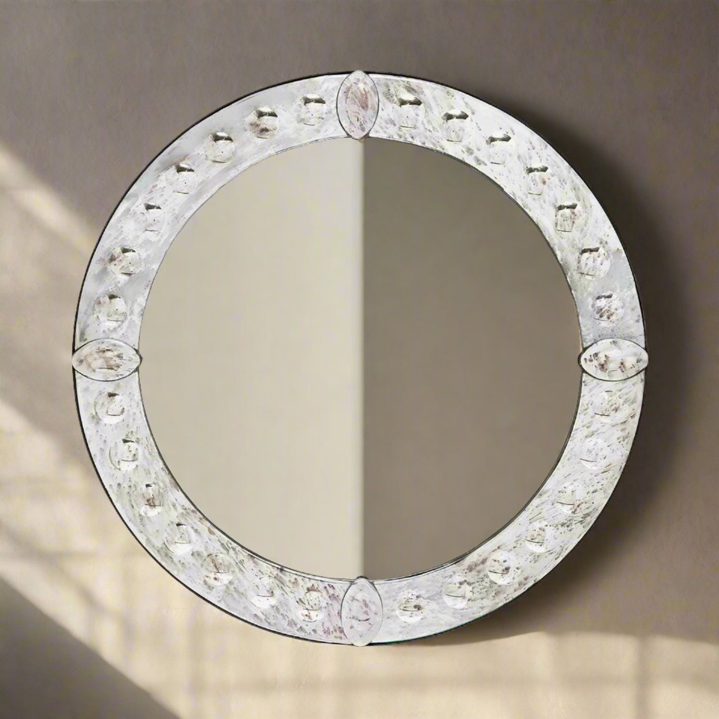 The Dianna Round Mirror from Made Goods is a stunning Venetian-style mirror with a large, round mirror and intricate floral overlays. Its antiqued-mirror border and back-etched circles add a touch of sophistication to any room, making it a versatile addition to your home décor.