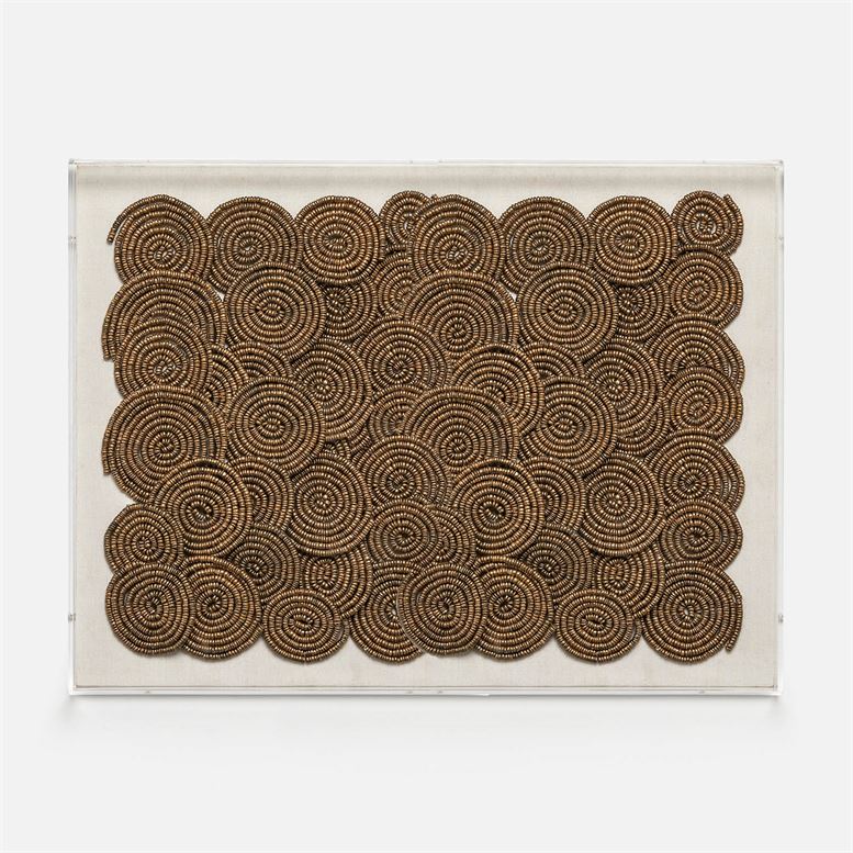 The Diesel Wall Art Bronze Coco Beads Rectangle effortlessly combines pop art inspiration with natural materials. Crafted by industry experts at Made Goods, this piece features overlapping spirals of strung coco beads, encased in a durable acrylic frame for a dimensional and visually stunning design.