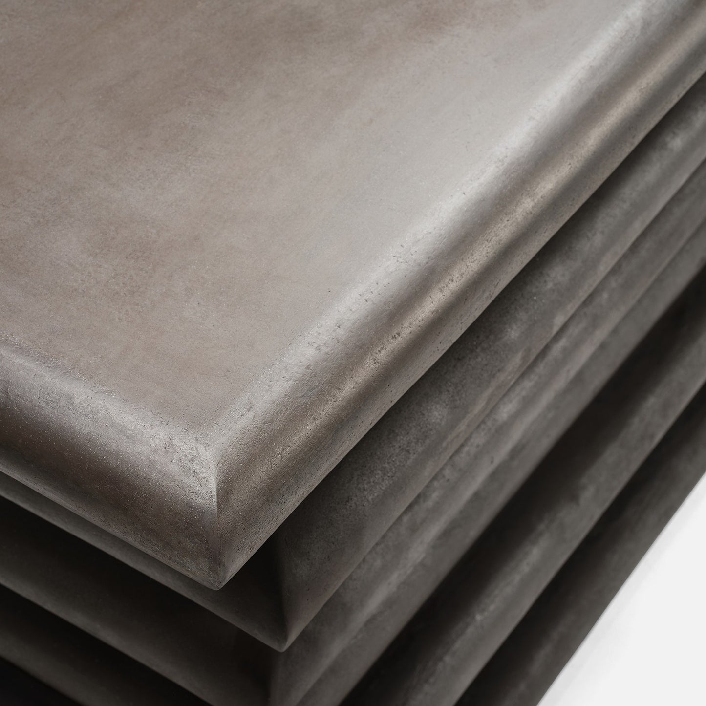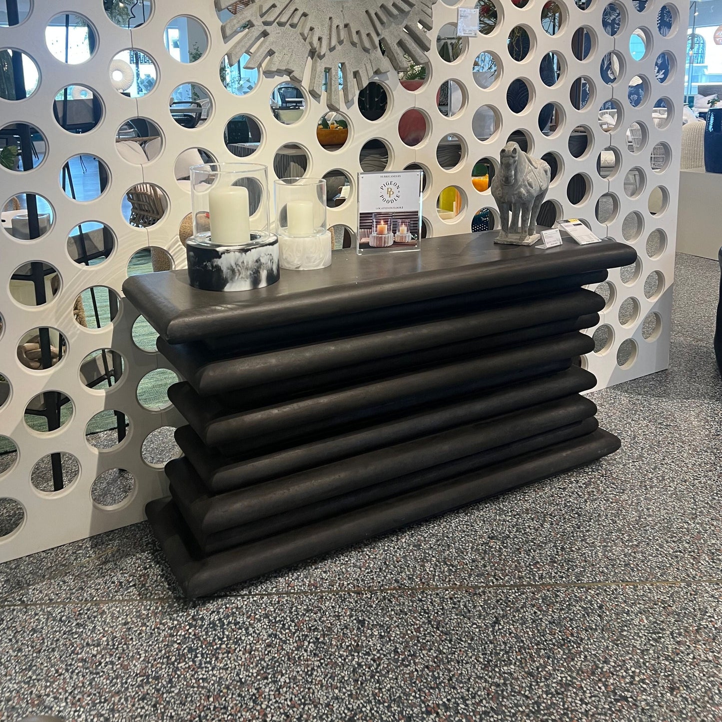 The Dorsey Console Table in Midnight Gray Stone from Made Goods features a stacked-layer console with a cool 70's vibe. The Dorsey is perfect for a statement-making design element in indoor and outdoor spaces alike.