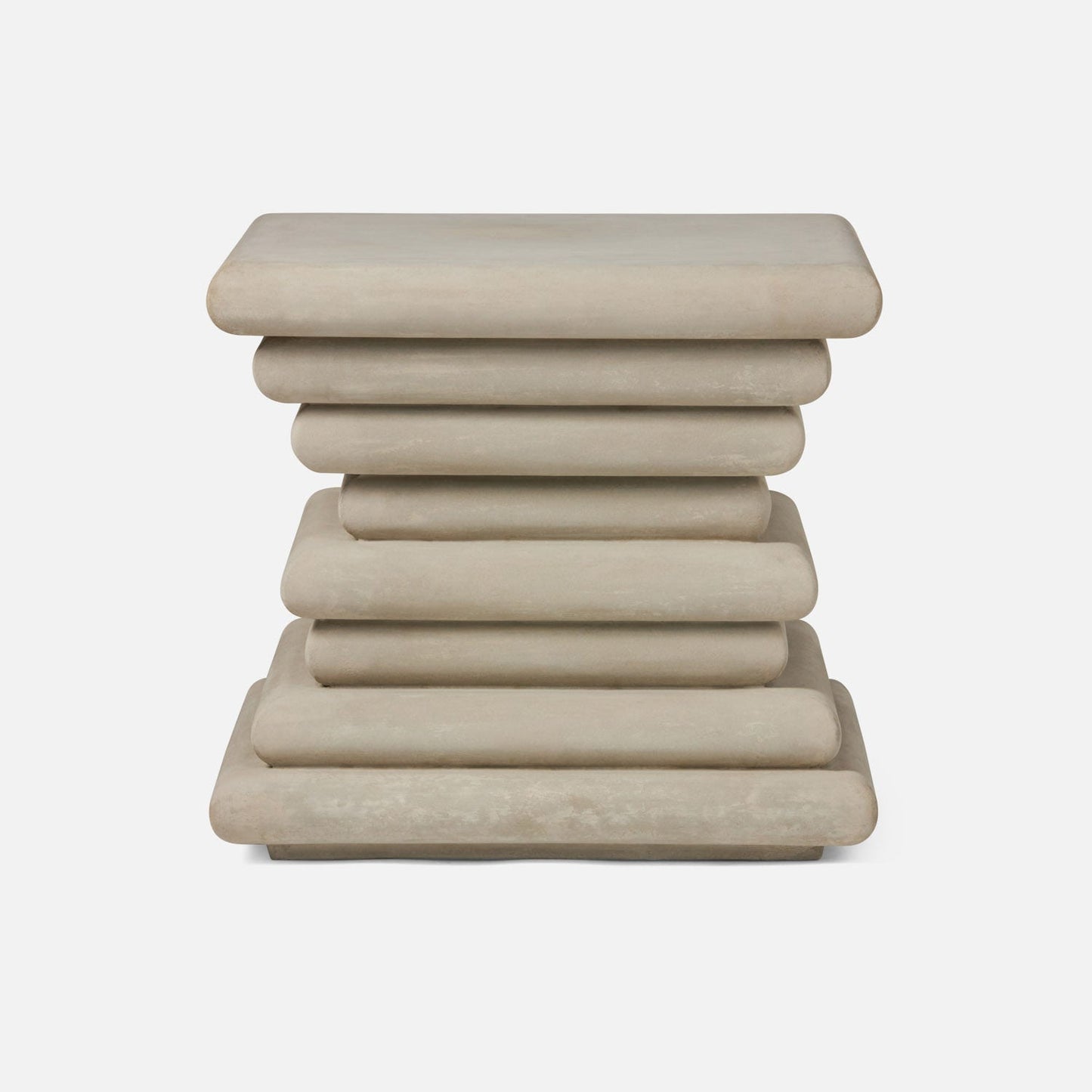 The Made Goods Dorsey Side Table in Light Gray Stone boasts a layered design that resembles the captivating geological formations of the Grand Canyon. The piece is crafted from brushed concrete, providing textured details and an industrial touch to its '70s-inspired aesthetic.