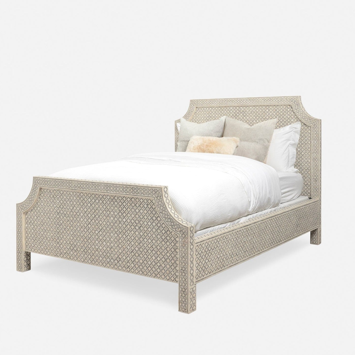 Experience bedroom luxury with the Dustin Bed in Natural Bone and Gray Resin. Handcrafted with small bone pieces and resin.