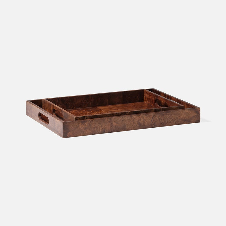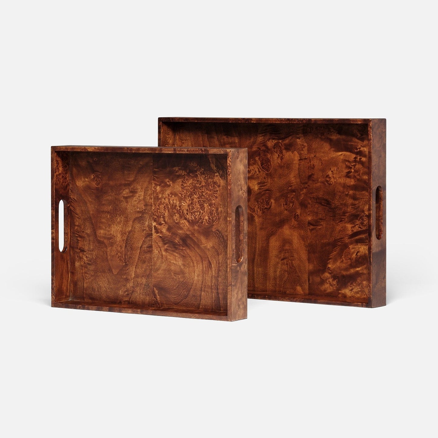 The Elita Tray Set in Dark Honey Burl by Made Goods features a beautiful contrast of mappa burl. This elegant rectangular tray set is crafted with natural elegance.