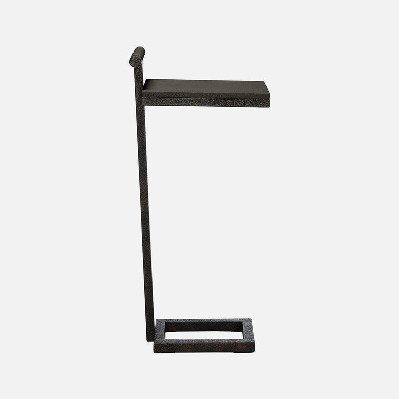 The Ellery Accent Table in Bronze and Black from Made Goods is highly portable and adds a touch of elegance to your living space. Its sleek metal base supports a faux shagreen panel and handle, making it perfect for holding drinks, laptops, or any essentials within reach.