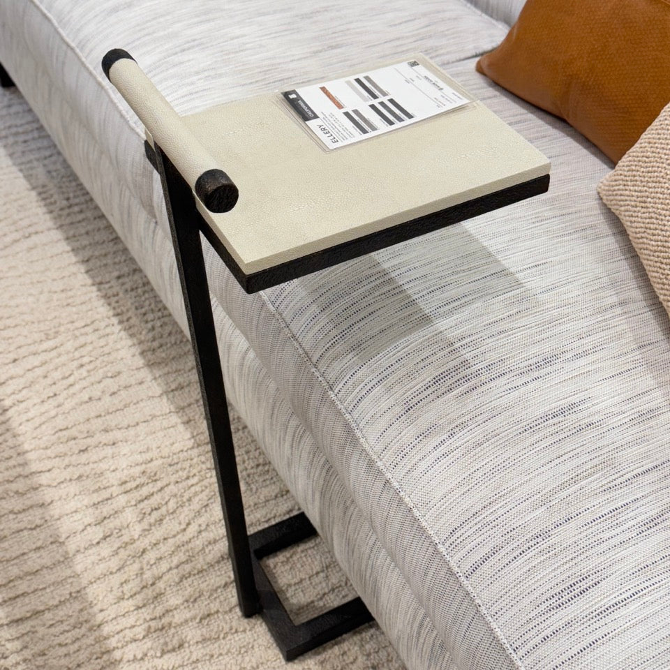 The Ellery Accent Table in Bronze and Blanc from Made Goods is highly portable and adds a touch of elegance to your living space. Its sleek metal base supports a faux shagreen panel and handle, making it perfect for holding drinks, laptops, or any essentials within reach.
