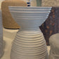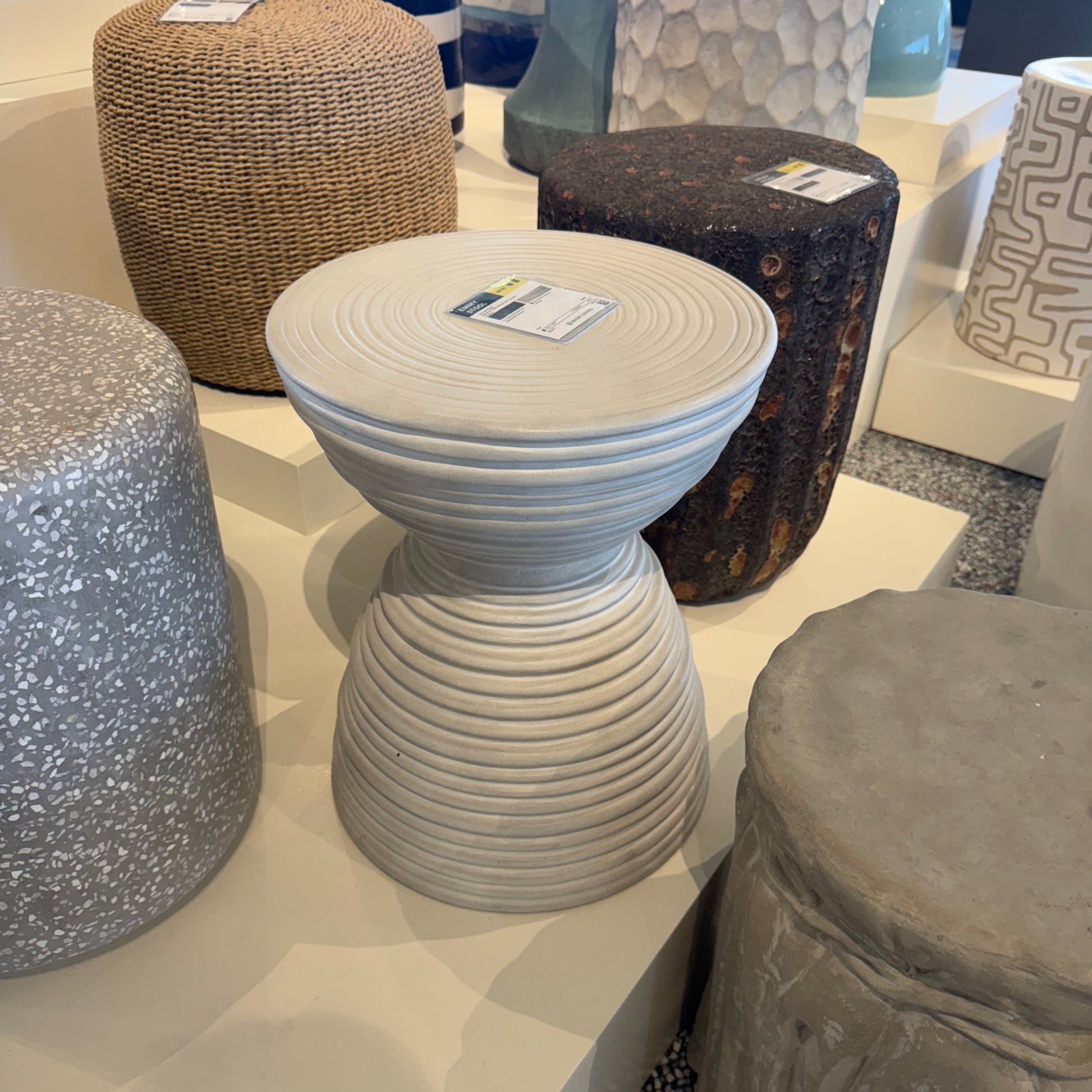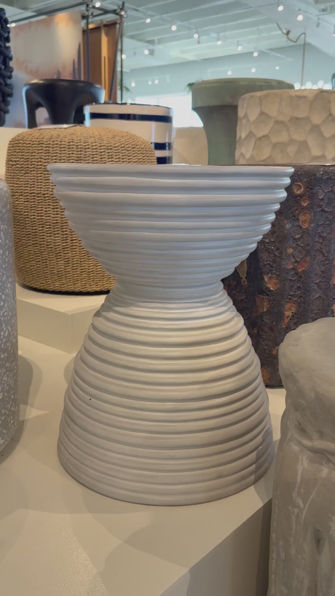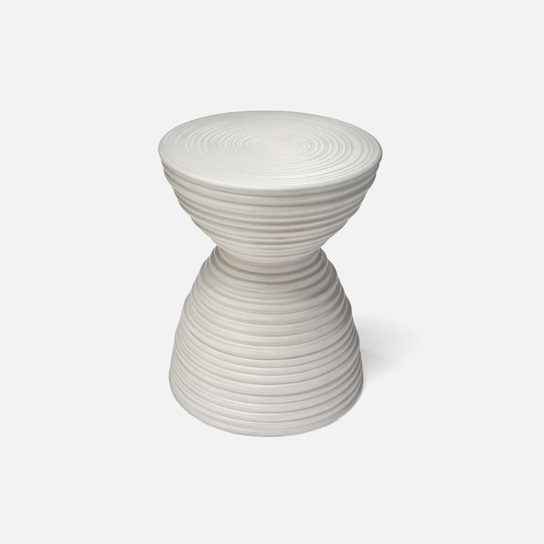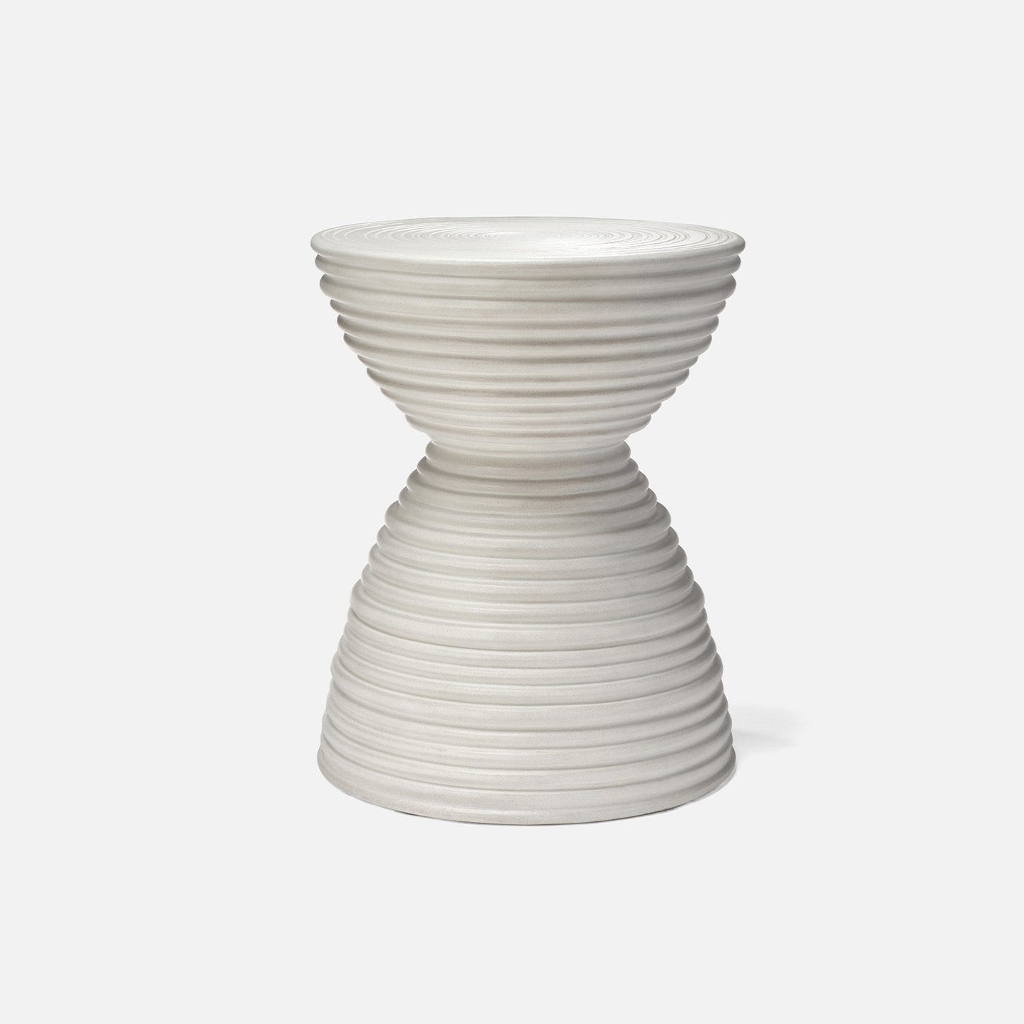 The Emmy Stool in Blanc Fiber Concrete by Made Goods is crafted from fiber-reinforced concrete, featuring elegant swirls that highlight its hourglass form, adding a dynamic sculptural touch to this durable design.