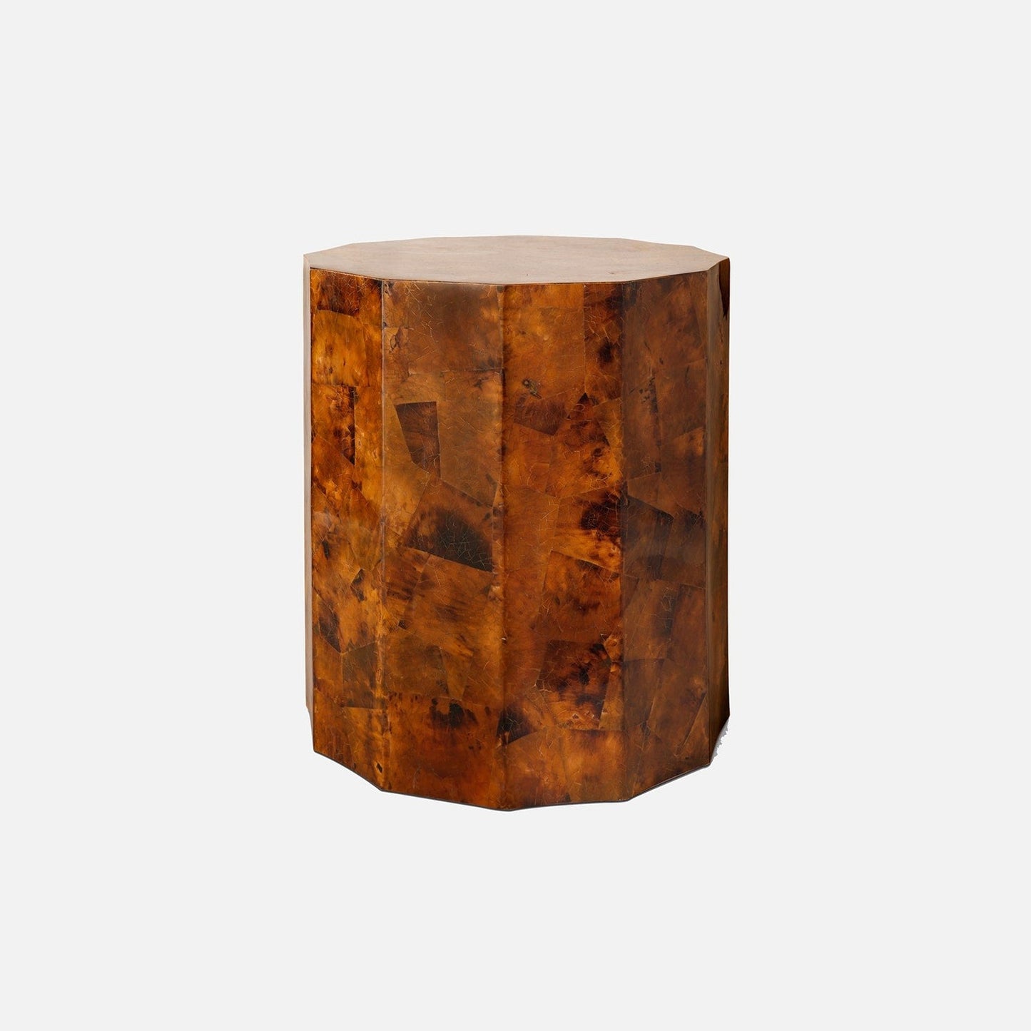 The Enzo Stool in Young Pen Shell from Made Goods is created with a molding process, requiring heat. Natural variations in color make this round, faceted piece totally unique and the young pen color is dramatic and bold.