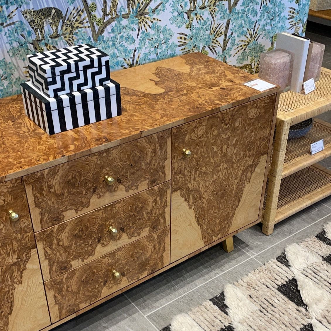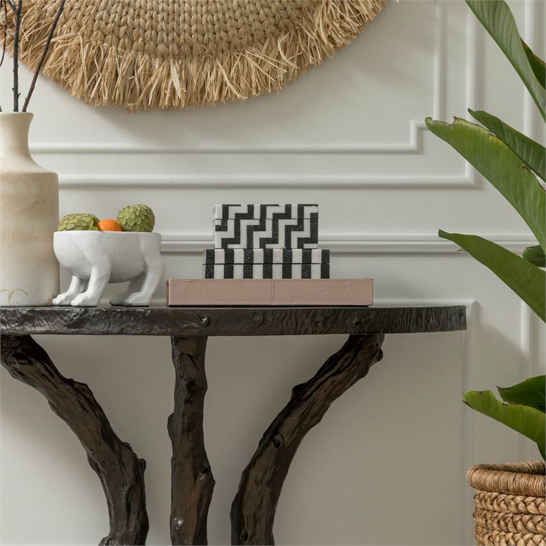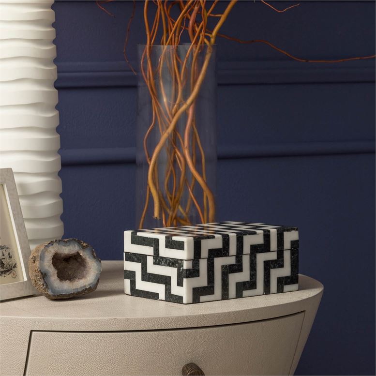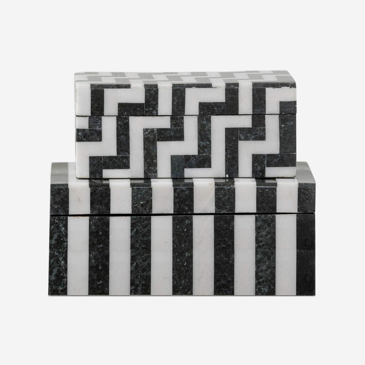 The Escher Box Set in Black and White from Made Goods is a visually stunning addition to any space. It is made with a combination of white and black marble, accentuated by black felt lining.