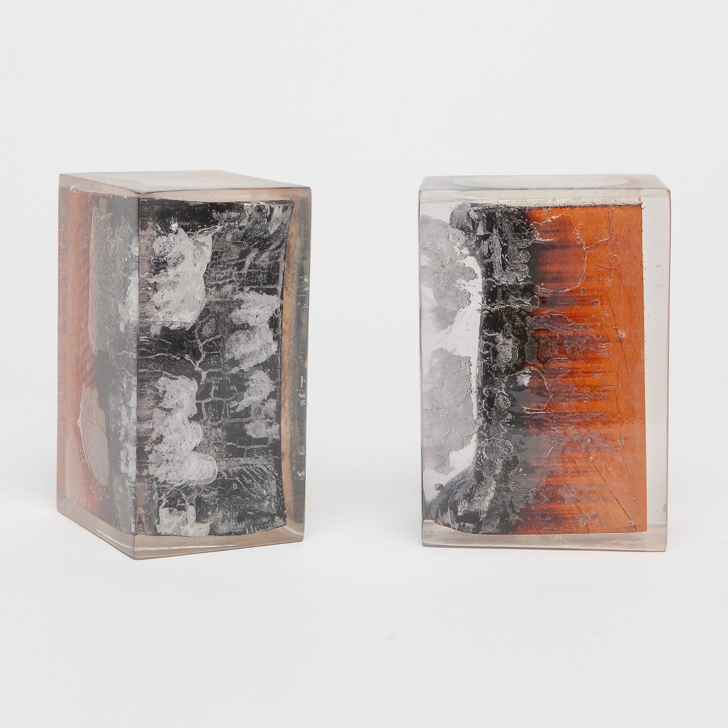 The Eskor Bookends by Made Goods have a unique ombre effect with burned wood and resin, adding a modern touch to any bookshelf, desk, or credenza.