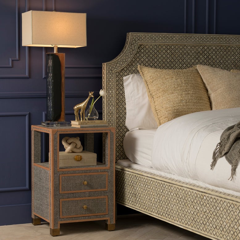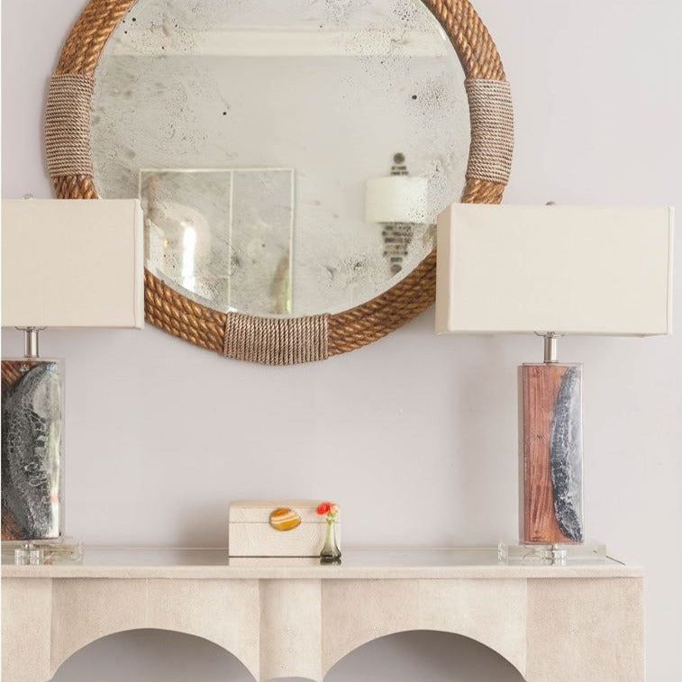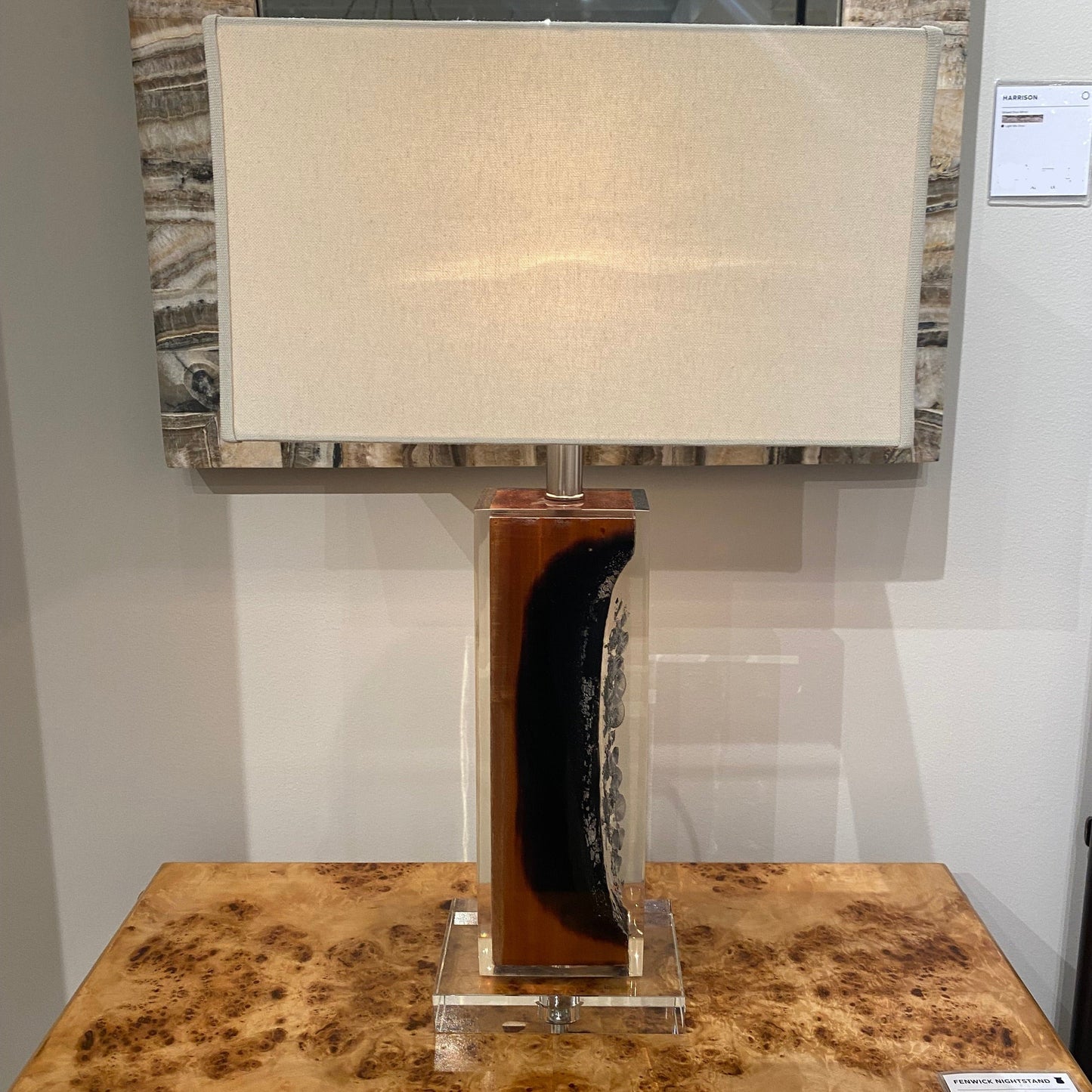 The Eskor Table Lamp in Wood and Resin from Made Goods offers a blend of modern and natural elements. Inside a resin square cube attached to an acrylic base, burnt wood is carefully incorporated, topped with a natural linen shade.