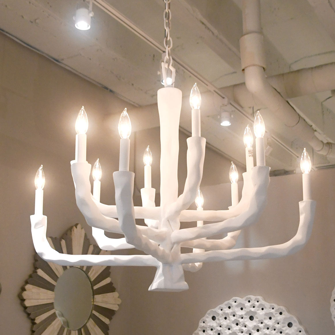Modern and organic, the Fawn Chandelier from Made Goods features 12 arms of white concrete. The white branches of the Fawn light extend around the chiseled finished frame. The strong aesthetic of the fixture by Made Goods creates a strong presence. We love the Fawn in an entry way or foyer, bedroom or dining room.
