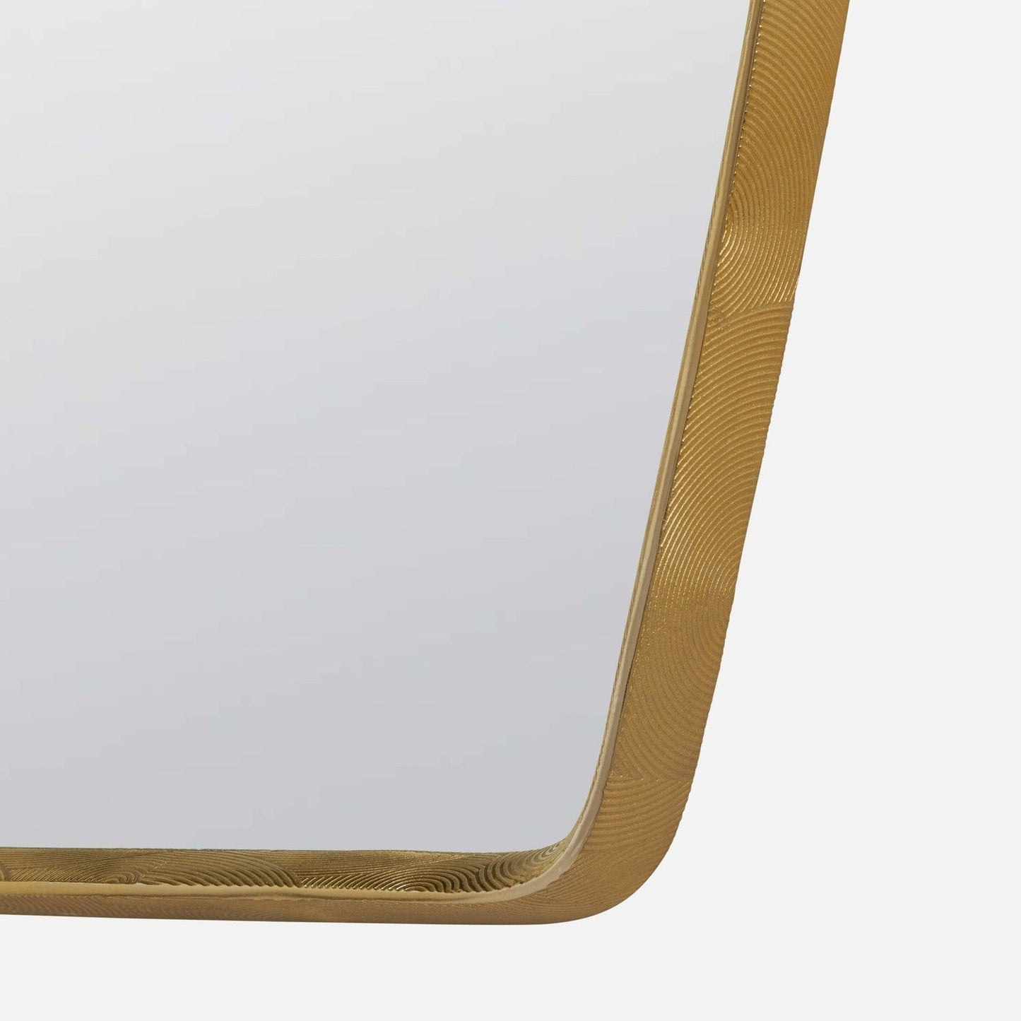 The Fenris Mirror in Matte Brass Aluminum from Made Goods features a rectangular frame with stretched long sides. Its brushed aluminum and shiny brass design with concentric circles adds a touch of Hollywood Regency glam. This mirror has a textured frame with a depth of approximately 1.75''.