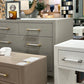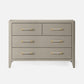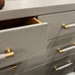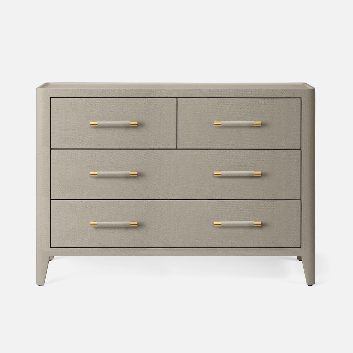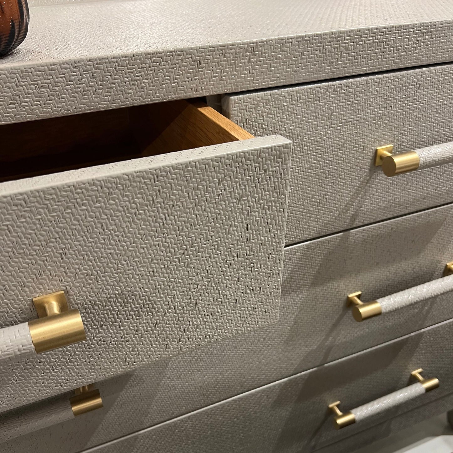 The Fergus 48" Dresser in Dove Gray Raffia by Made Goods features a natural raffia construction complemented by streamlined metal drawer handles. This dresser offers a sophisticated and distinctive presence, ideal for placement beside a bed.