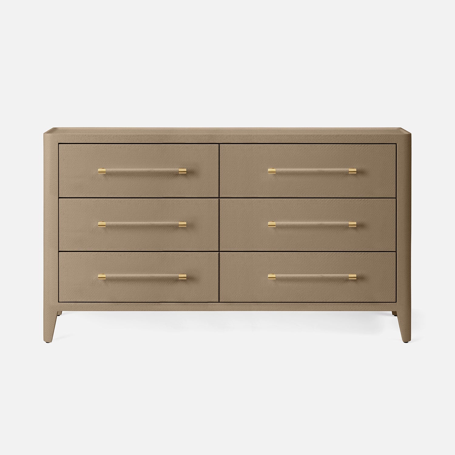 The Fergus 60" Dresser in Taupe Raffia by Made Goods features a natural raffia construction complemented by streamlined metal drawer handles. This dresser offers a sophisticated and distinctive presence, ideal for placement beside a bed.