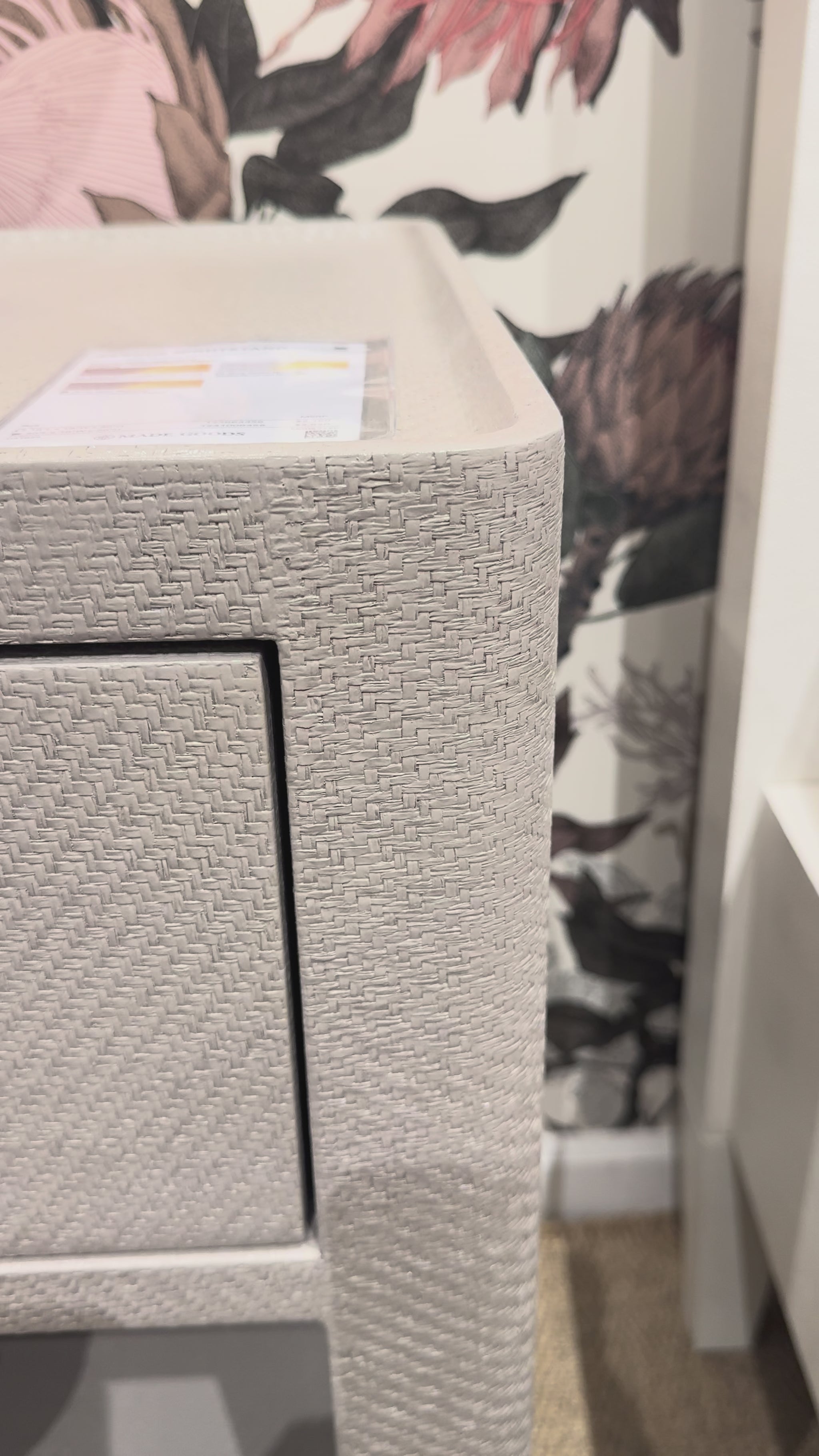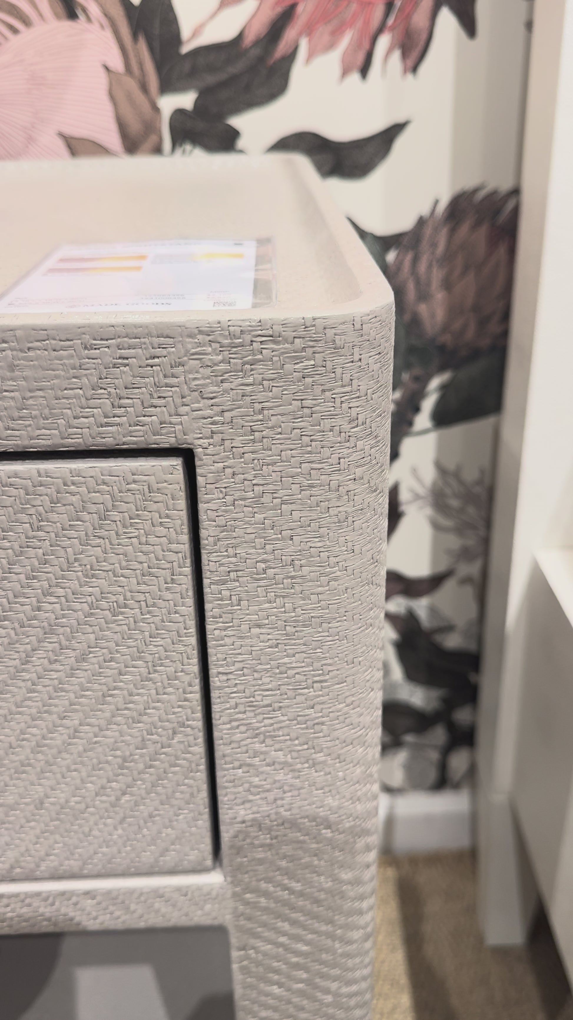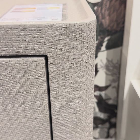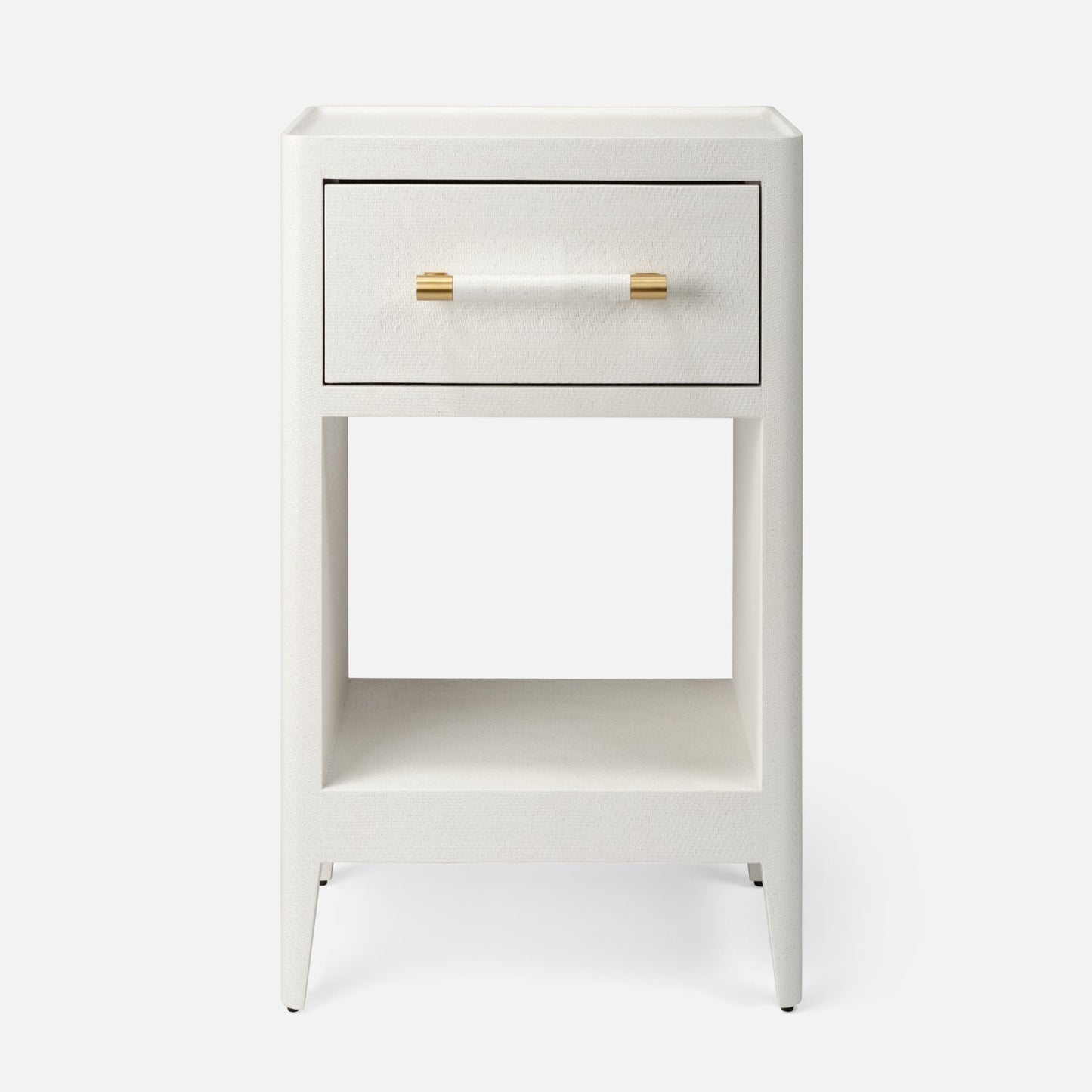 The Fergus Single Nightstand in White Raffia and Gold by Made Goods combines white raffia with gold accents for a refined bedside statement piece. Its sleek metal drawer handle complements the textured surface, creating an elegant yet functional design element for sophisticated bedroom spaces.