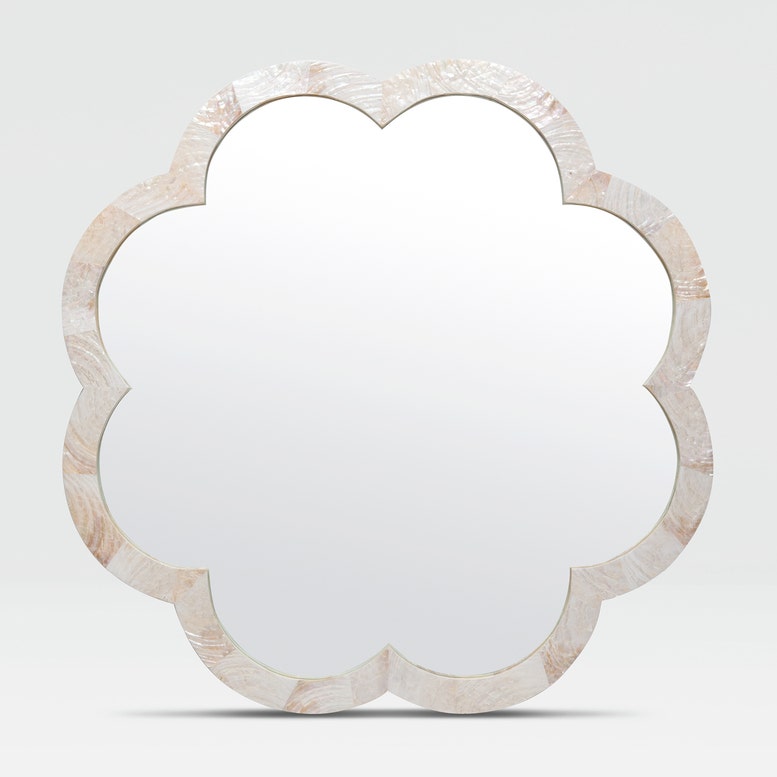 The round Fiona Mirror in Kabibe Shell from Made Goods features a dramatic scalloped shape for intriguing accentuation. Modern decorative wall mirrors with a floral-inspired design bring light and depth to any area of the home or office.