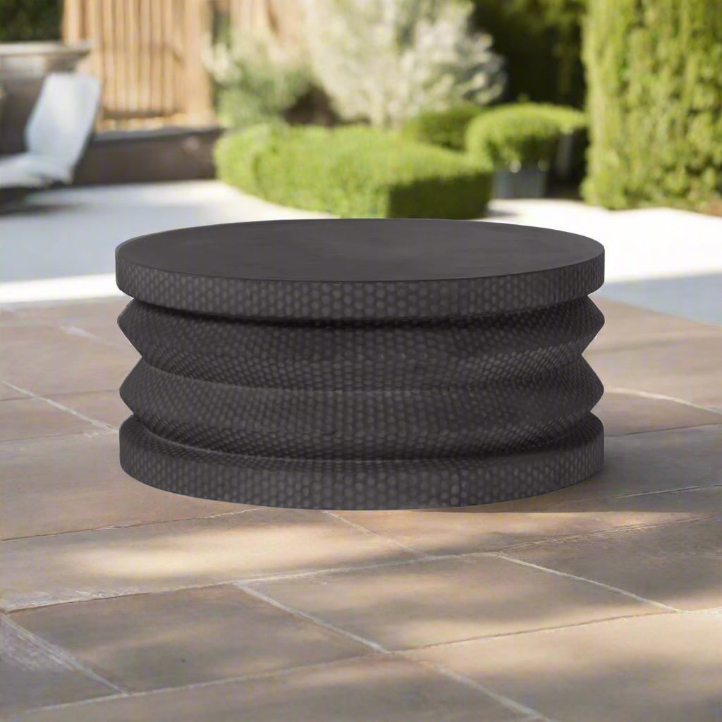 Solid and sculptural, the outdoor Frasen Coffee Table in Onyx Concrete from Made Goods exudes a strong presence. With a geometric faceted silhouette, the all-weather concrete coffee table has a hammered texture on its sides and a smooth, polished flat top that's perfect for resting drinks and snacks al fresco. Available in multiple sizes.