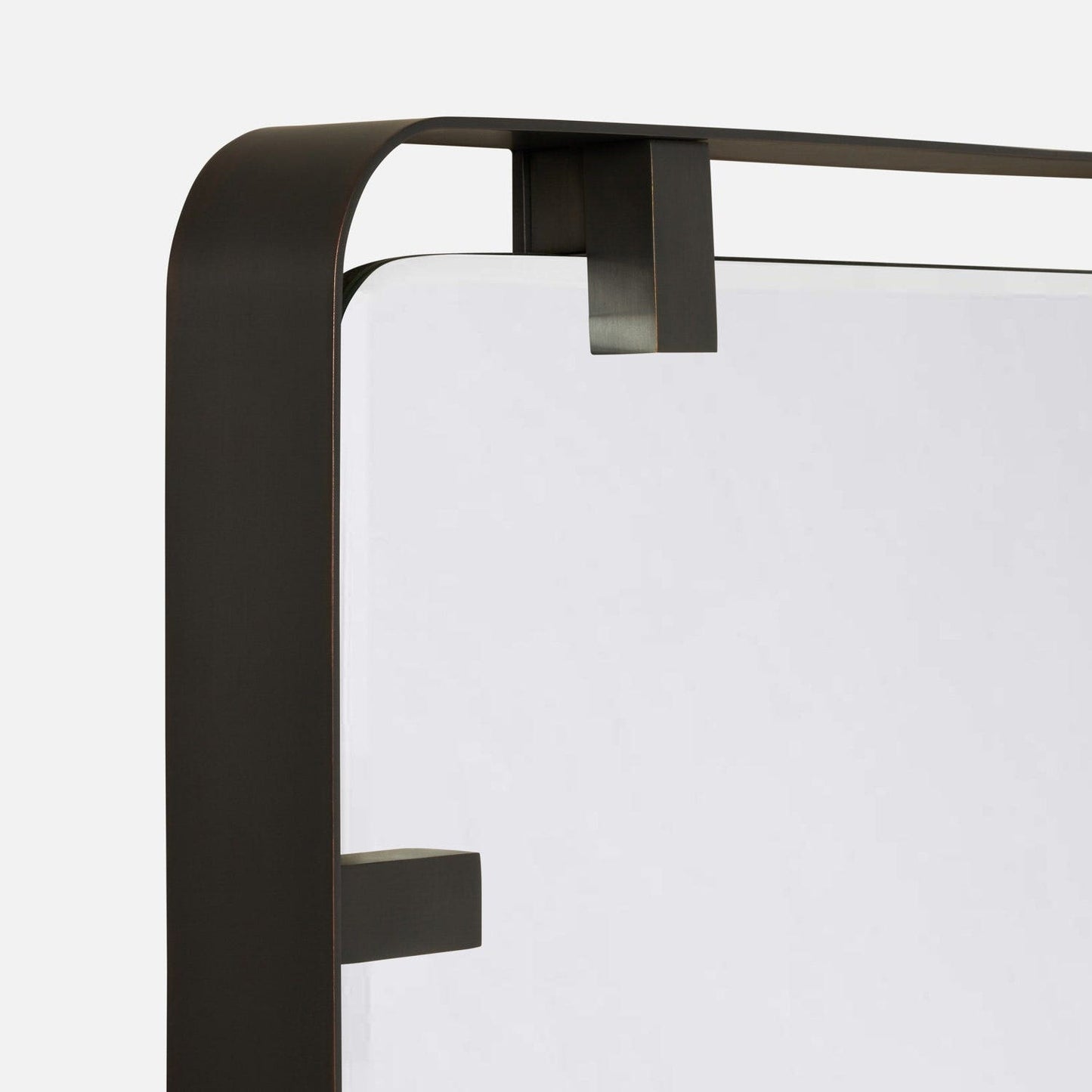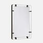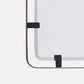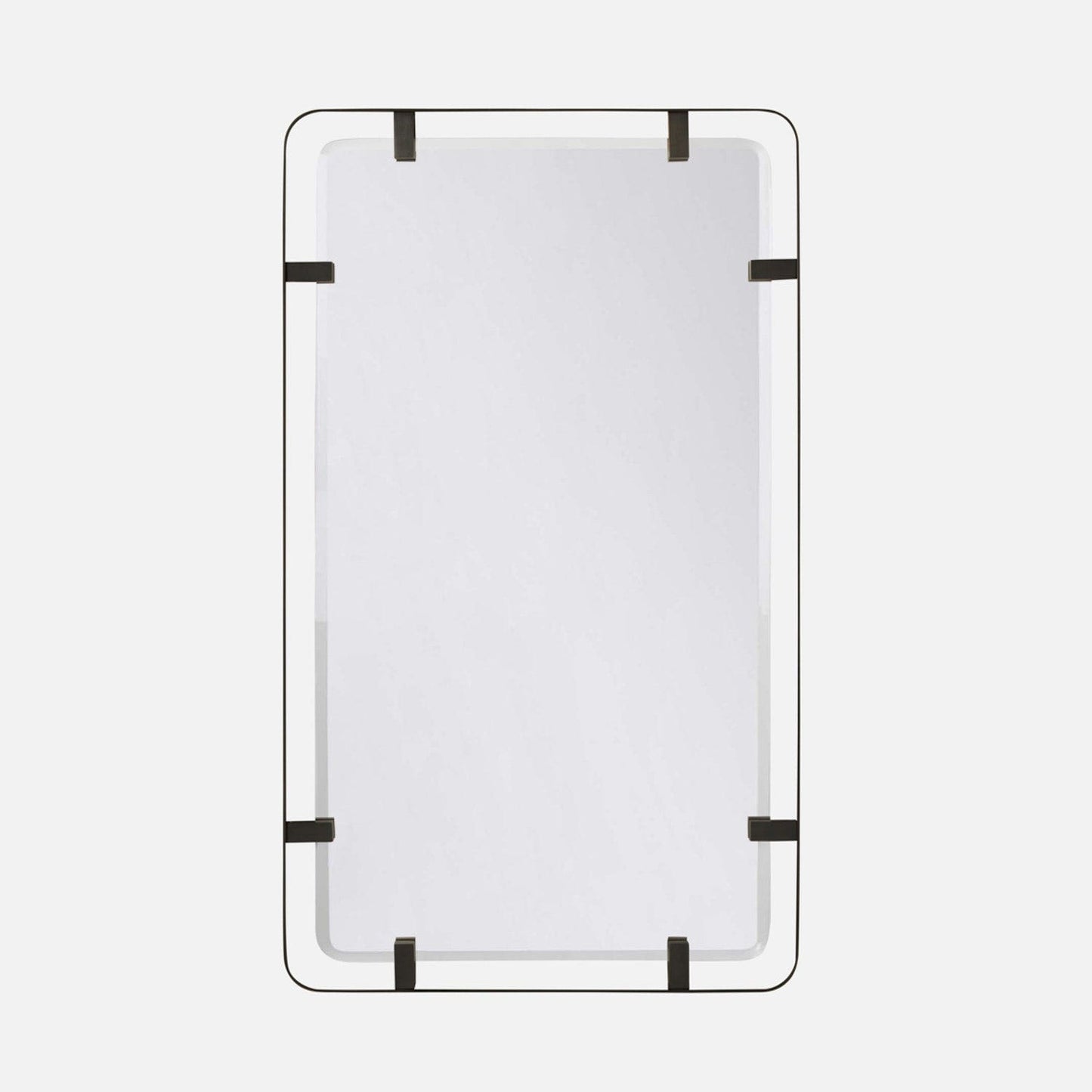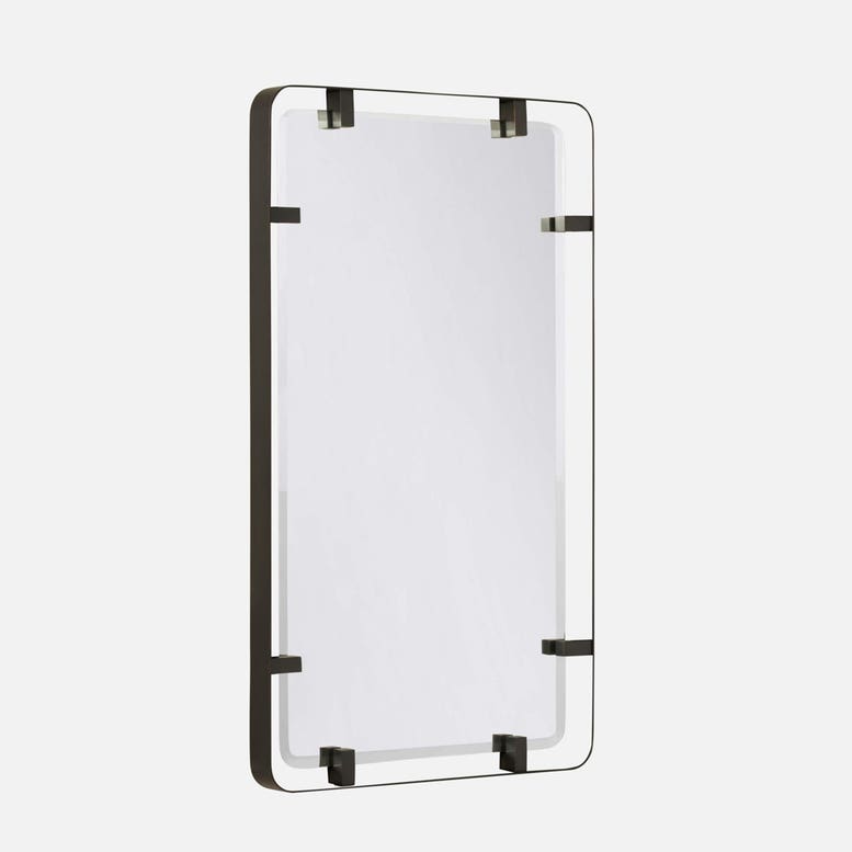 The Fremont Mirror in Bronze Steel by Made Goods combines minimalist design with distinctive steel hardware. Rounded corners soften its rectangular shape, while bold side tabs add stylish detail. It features a shadow box frame about 2 inches deep.