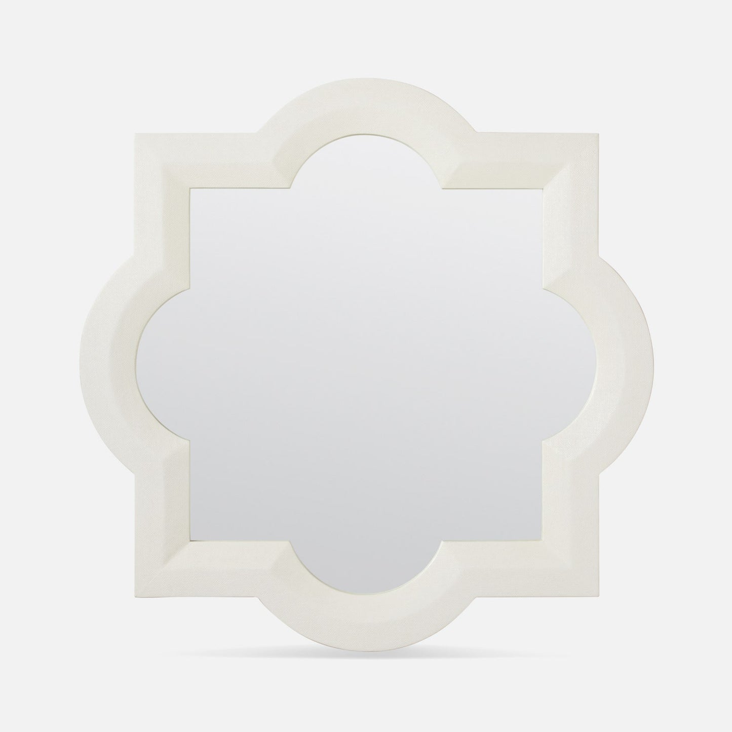 Uncommon geometrics define the Gabriella Mirror in Pristine Faux Canvas from Made Goods. The Gabriella Mirror is a simple yet distinctive flat mirror that gracefully merges square and quatrefoil shapes. The beveled frame, covered in faux canvas, has a pebble-like appearance and texture, without the weight.