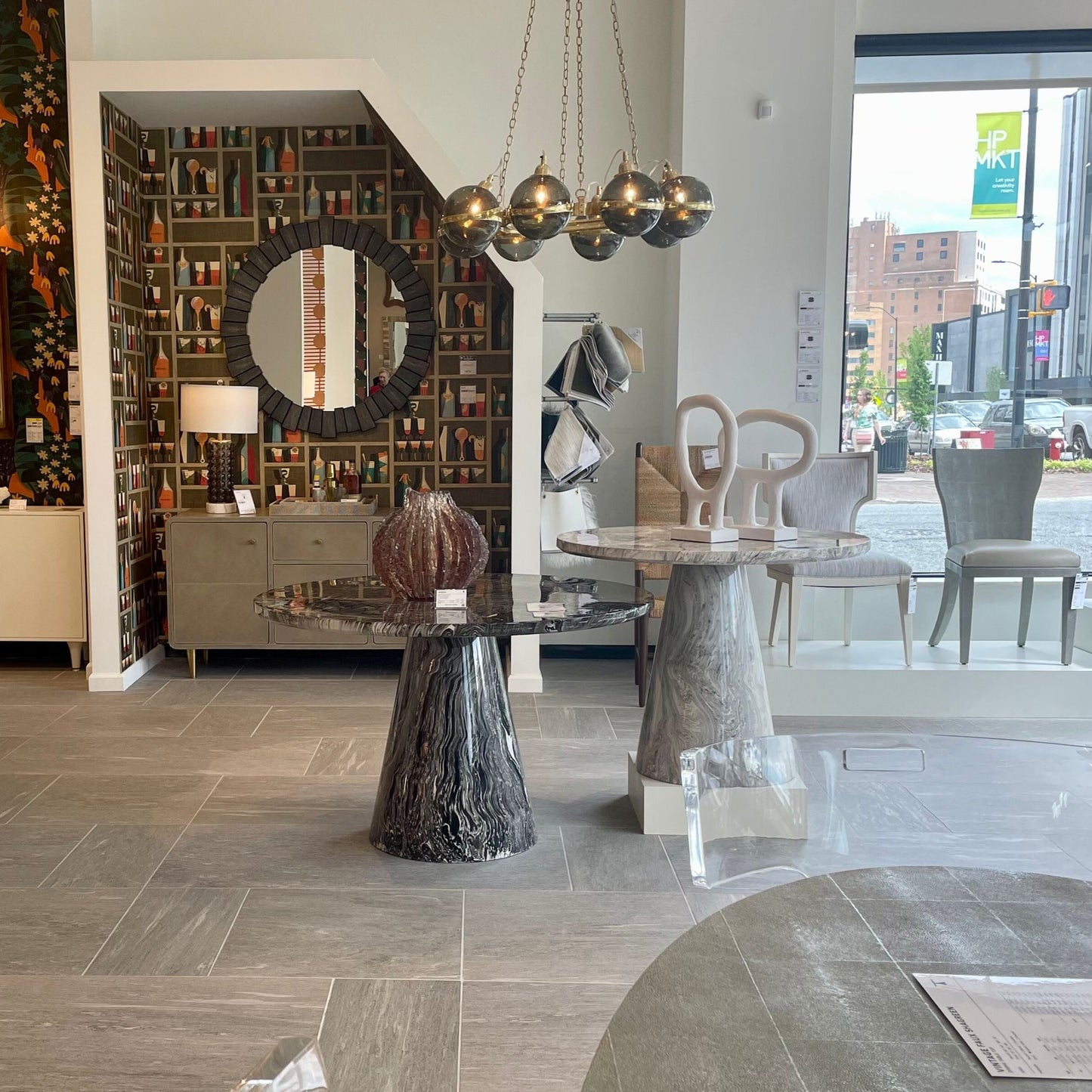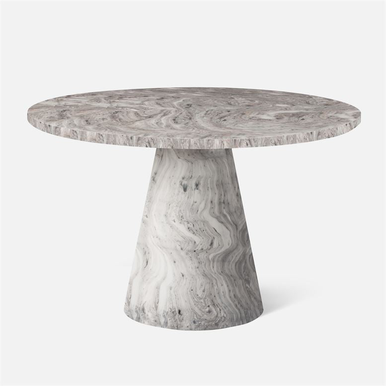The Giovanni Dining Table in Gray Swirl Lacquered Resin from Made Goods features hand-painted lacquered resin in a graceful swirling motion. The marbelized pattern on the surface makes a bold statement in dining spaces and entryways.