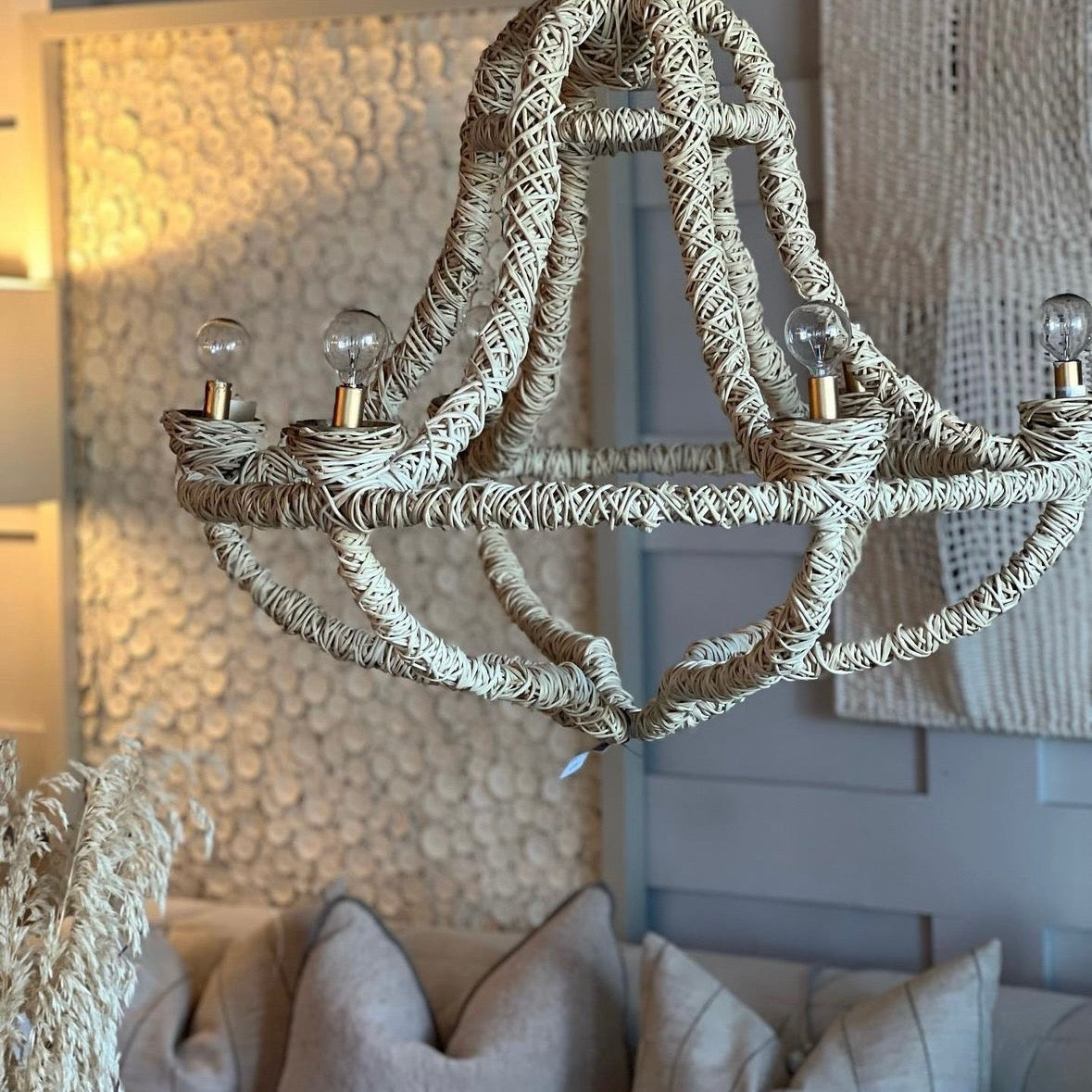 The fashion-forward Gloria Chandelier from Made Goods is elegantly wrapped in natural fibers inspired by the intricate beauty of birds' nests. This eye-catching chandelier can bring a natural element to a contemporary space, or a touch of texture to just about any environment.