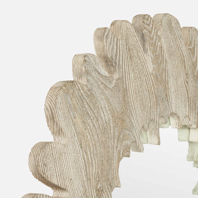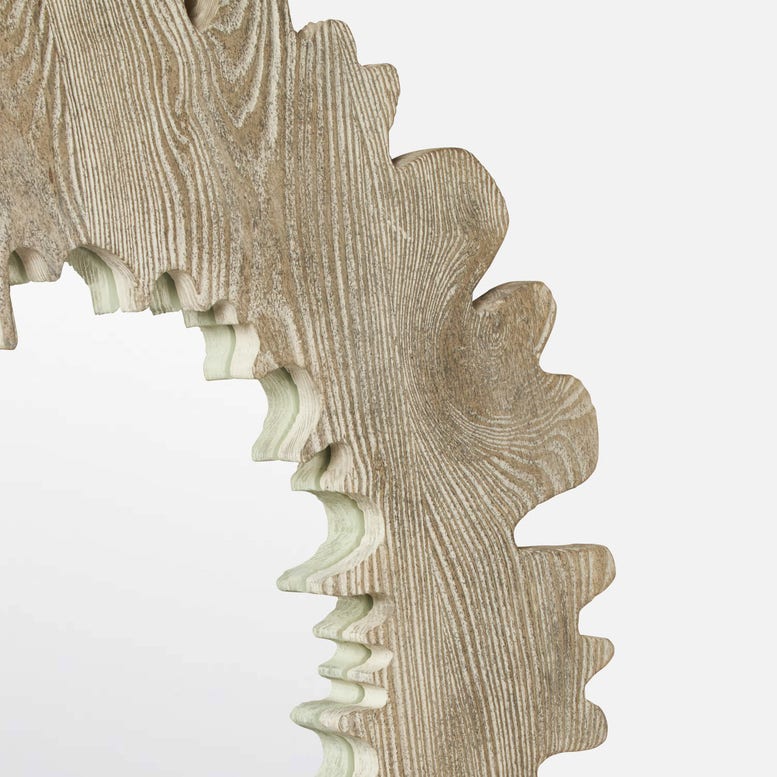 A flat mirror with a natural bend, the spectacular contour of the Gower Mirror in Gray Pine Wood from Made Goods mimics the cross-section of a mighty tree. A whitewashed finish enhances the pine frame's swirling variations and richly textured grain.