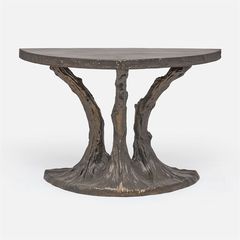 The Greta Console in Antique Bronze Resin from Made Goods features a charming demilune shape. Made from resin that has been hand textured for depth and detail, the bronze-finished Greta features a nature-inspired base with three branches that perfectly pair with the console's half-moon top.
