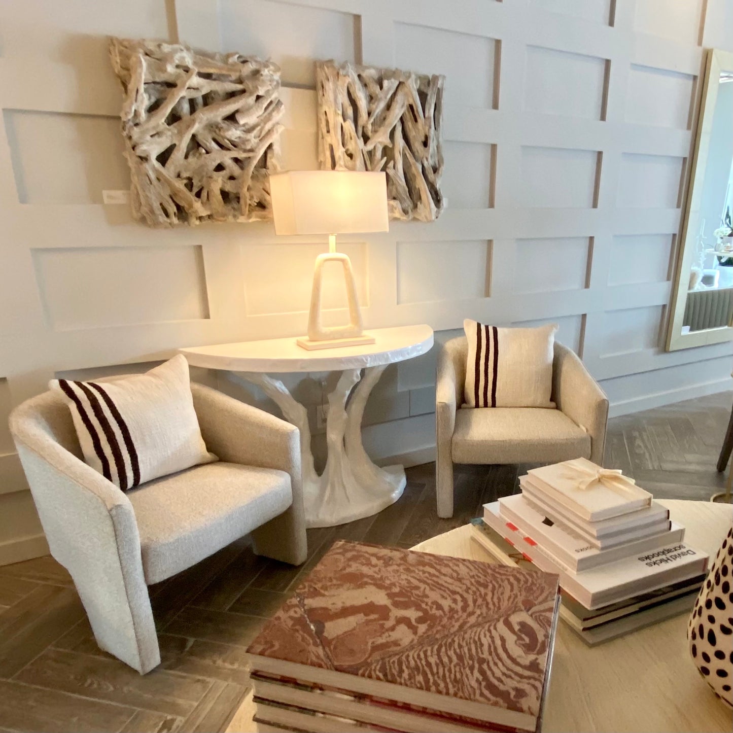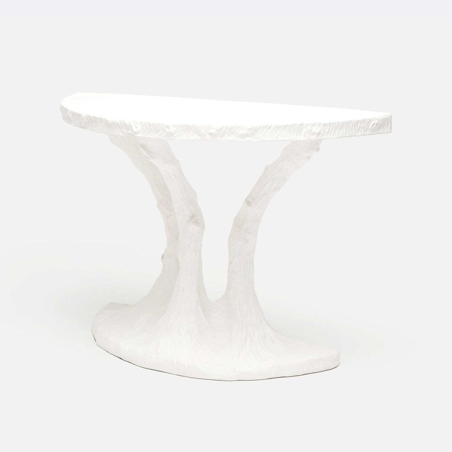 The Greta Console in Flat White Resin from Made Goods features a charming demilune shape. Made from resin that has been hand textured for depth and detail, the stark white Greta features a nature-inspired base with three branches that perfectly pair with the console's half-moon top.