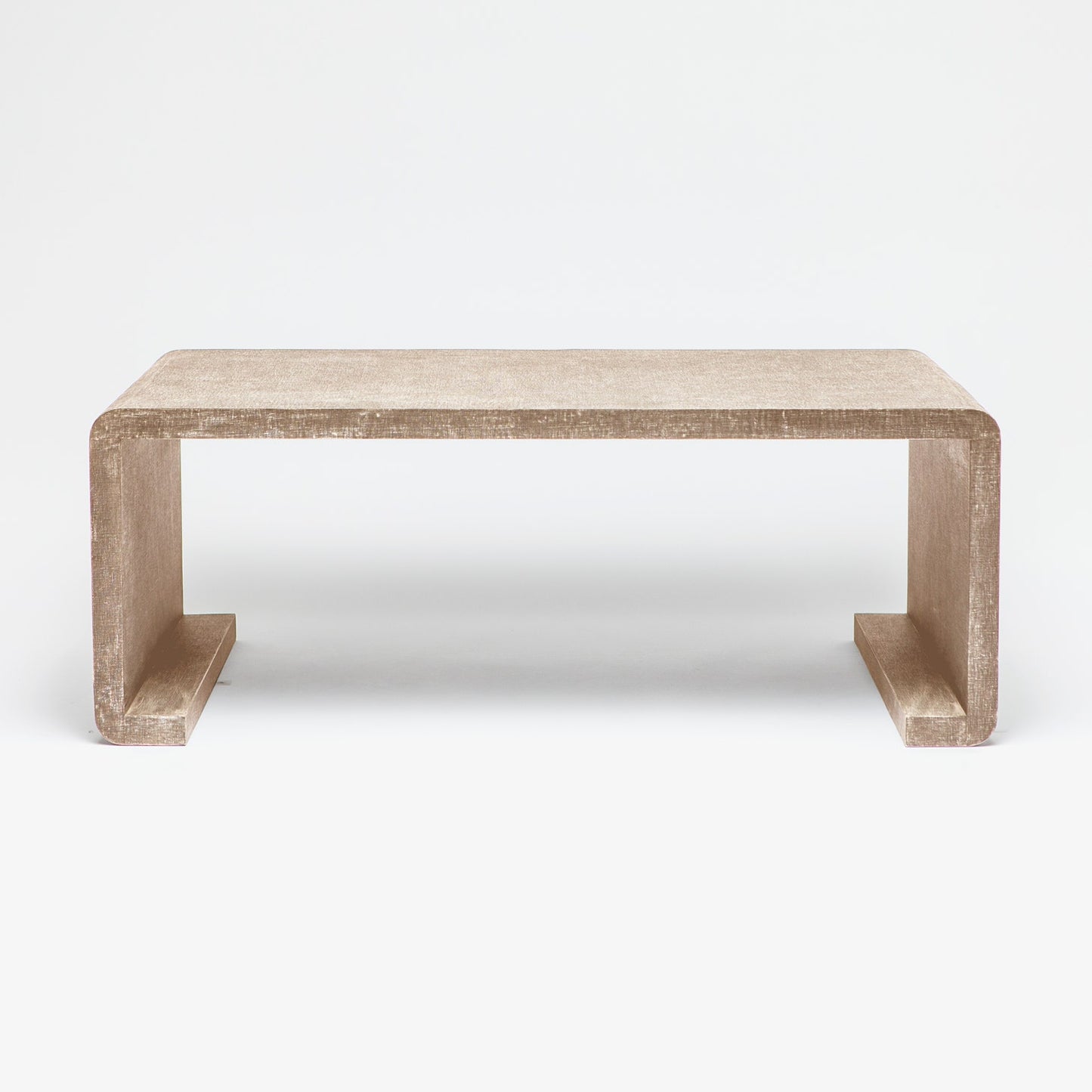 Experience luxury with our Made Goods Gustav Coffee Table. Its faux waxed linen finish and waterfall design add an elegant touch to any living room. Plus, its versatile neutral color complements any design.