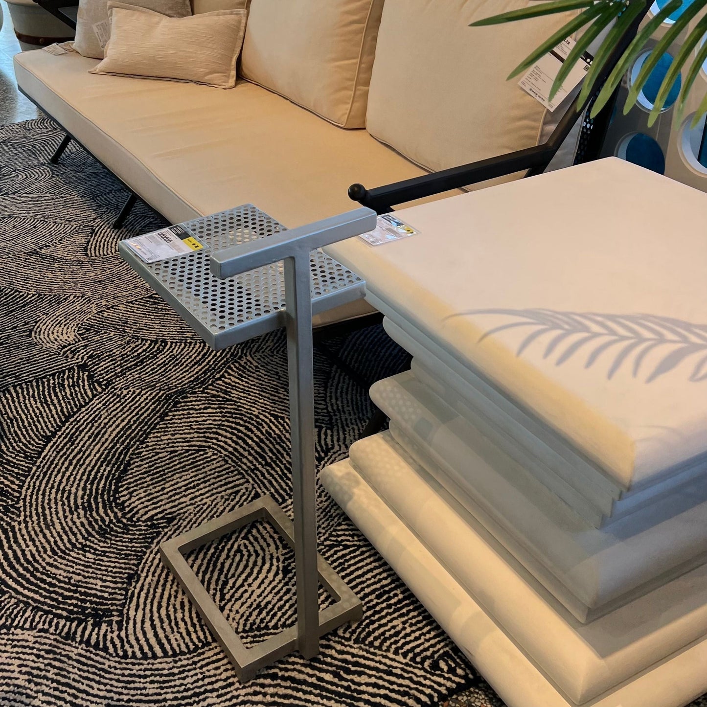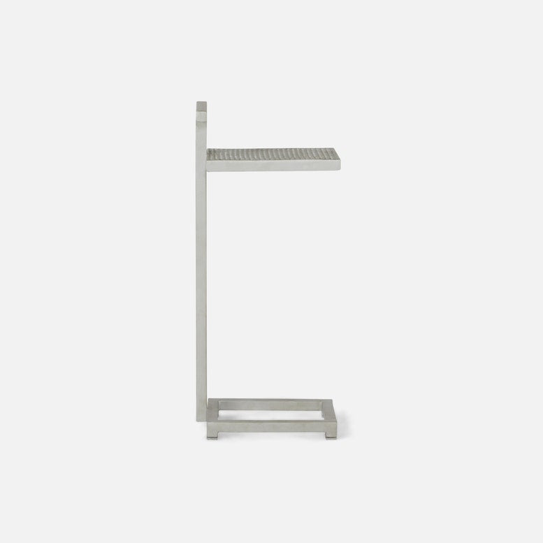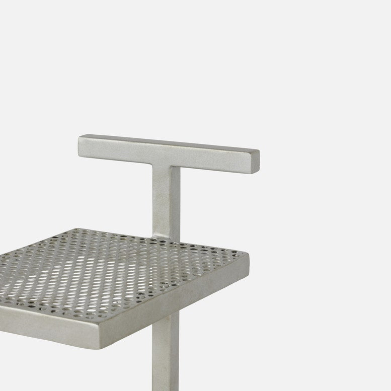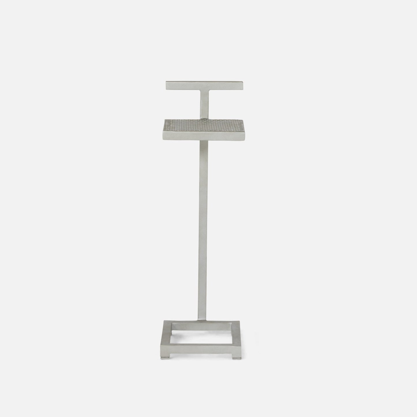 A versatile accent for outdoor entertaining, the metal Hadley Accent Table in Silver Mesh Metal from Made Goods has a breathable mesh tabletop and a simple handle that makes it easy to pick up and move to where it is needed.