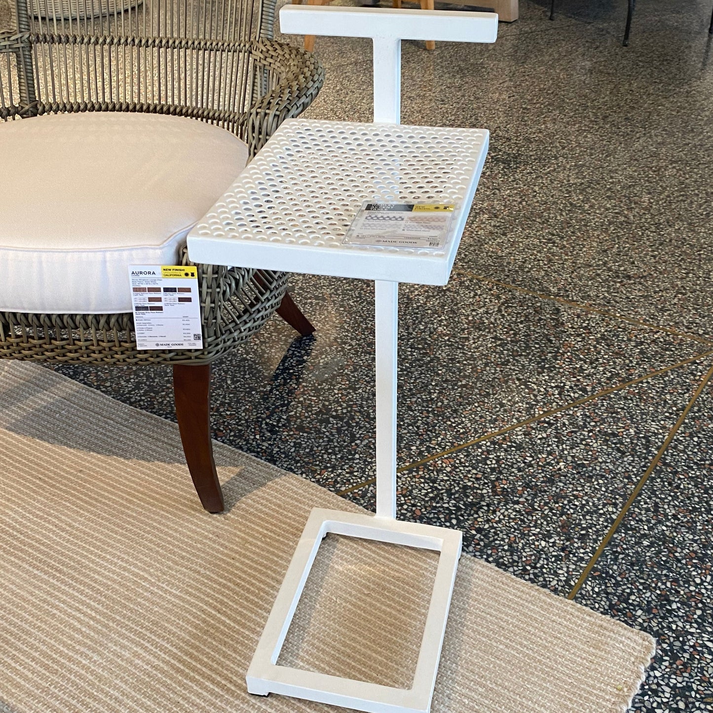 A versatile accent for outdoor entertaining, the metal Hadley Accent Table in White Mesh Metal from Made Goods has a breathable mesh tabletop and a simple handle that makes it easy to pick up and move to where it is needed.