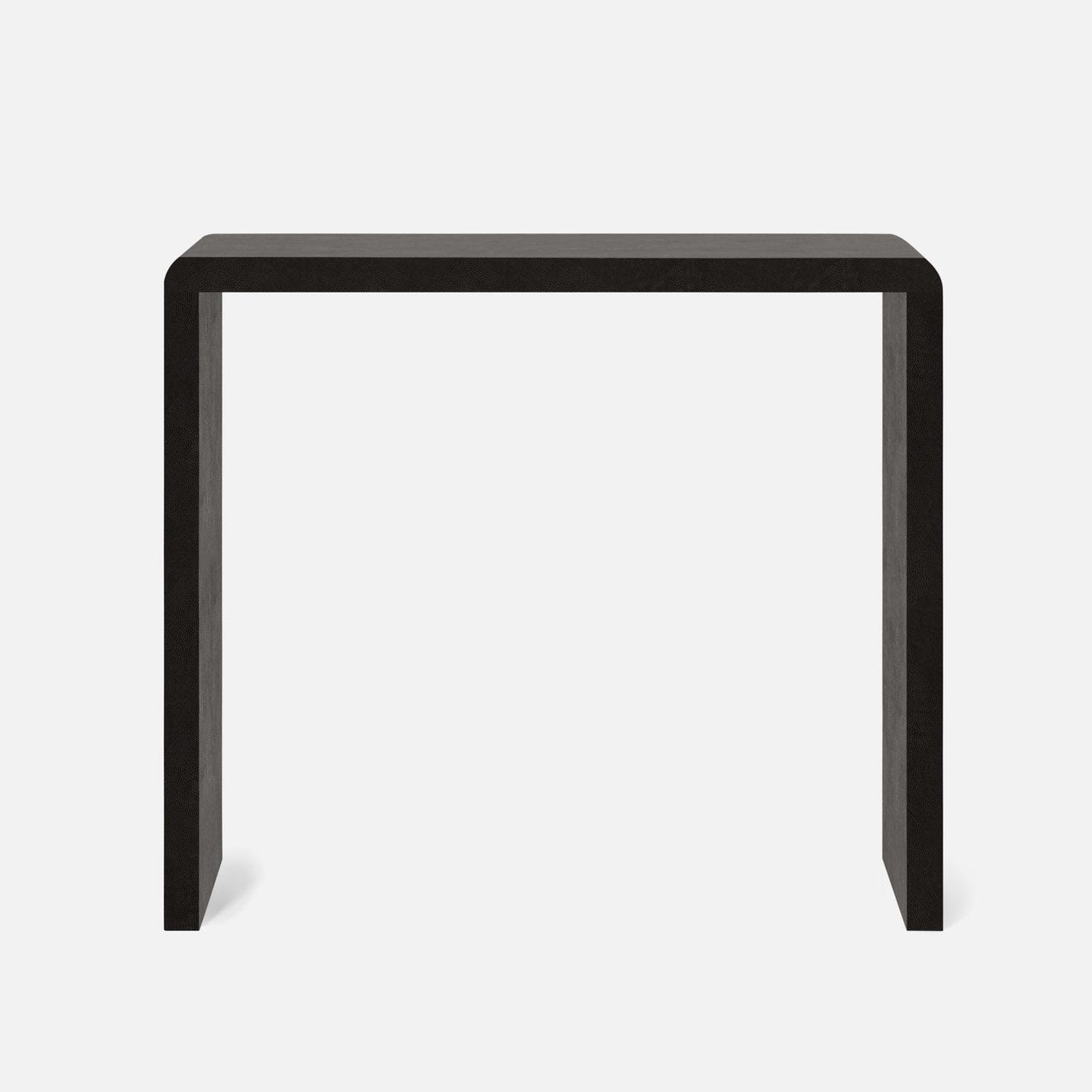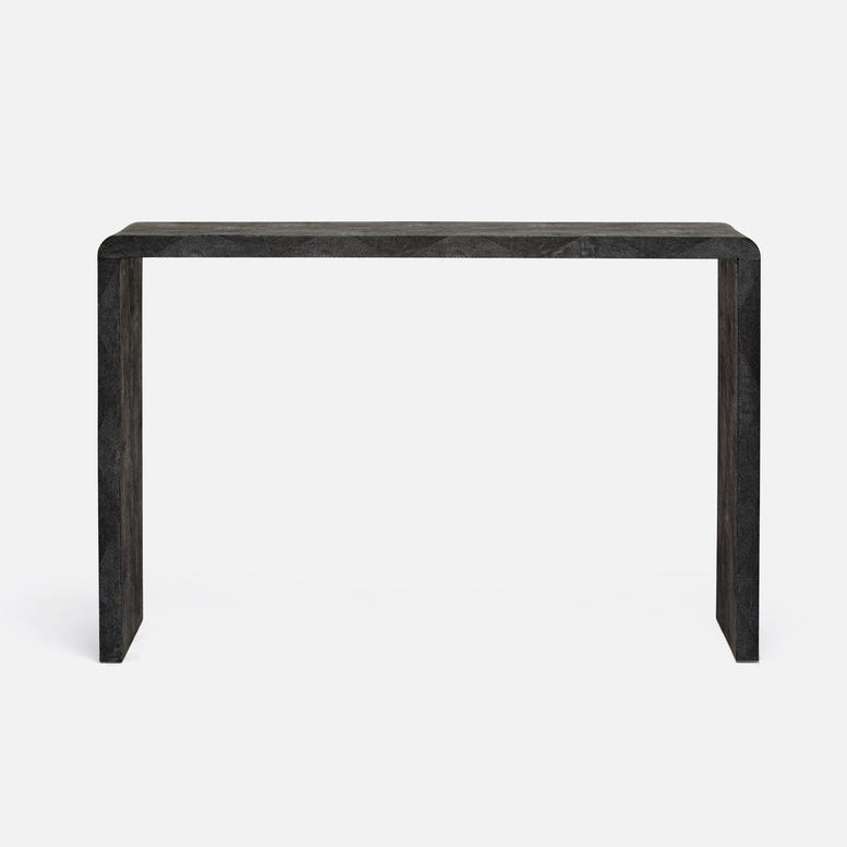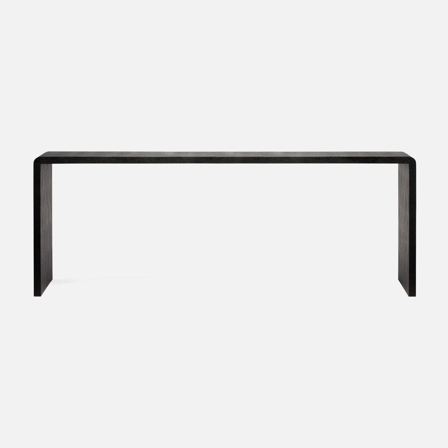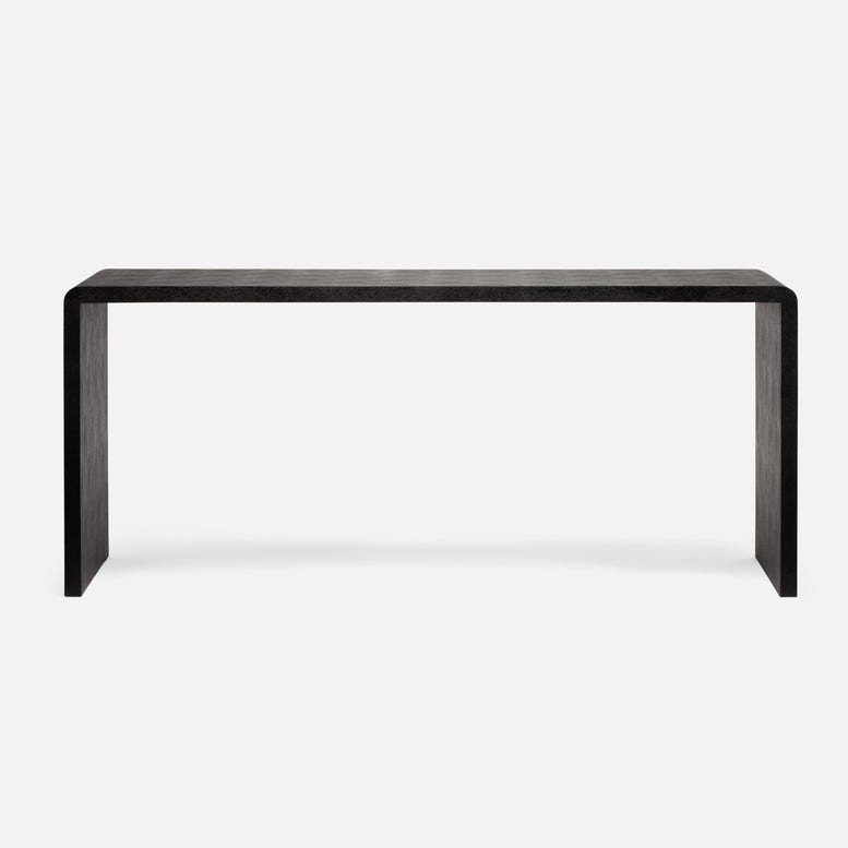 The Harlow Console in Black Faux Shagreen from Made Goods reflects a free floating design, the ultimate in waterfall console tables. A versatile console table like the Harlow, shaped like a rectangle, can be used as a bar, in the entryway, or as a sofa table.