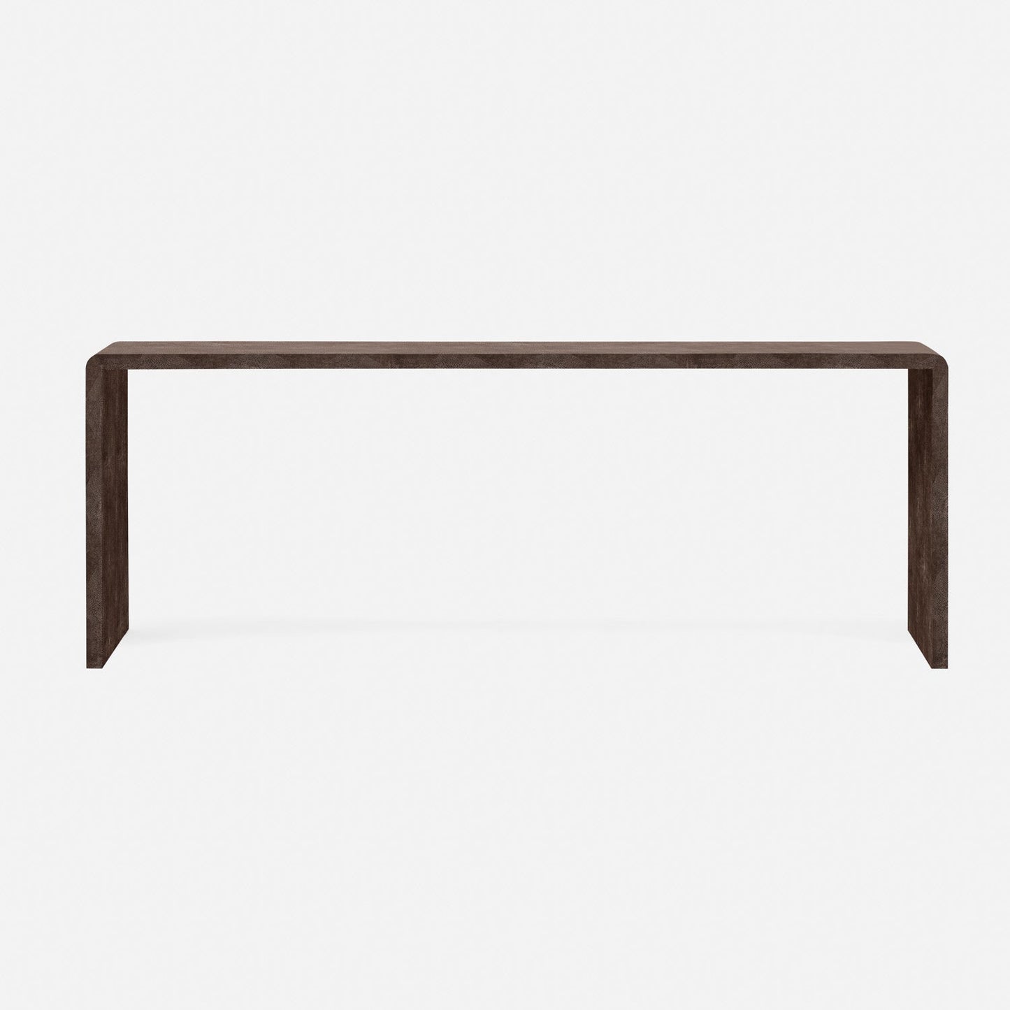The Harlow Console in Dark Mushroom Faux Shagreen from Made Goods reflects a free floating design, the ultimate in waterfall console tables. A versatile console table like the Harlow, shaped like a rectangle, can be used as a bar, in the entryway, or as a sofa table.