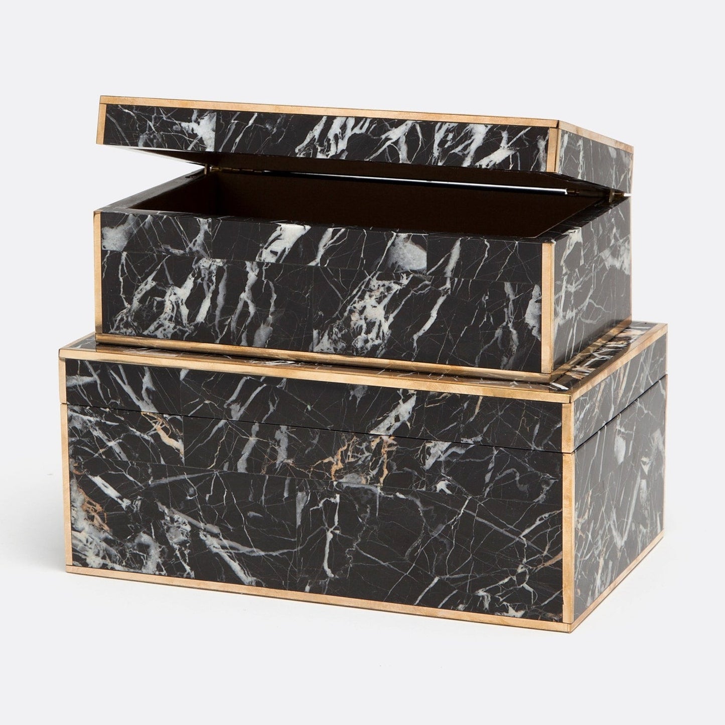 Transform your space with the Harold Box Set from Made Goods. The black and white marble finish and brass border add a touch of luxury to any room. Perfect for storing essentials, remotes, and electronic equipment, these boxes add a stylish, masculine touch to your office or family room.