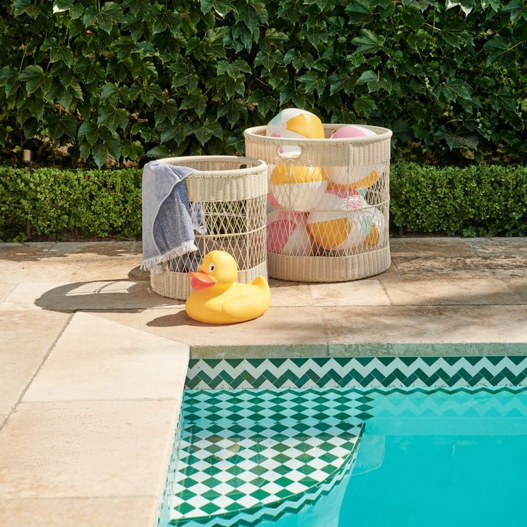 The Henley Basket Set features all-weather faux wicker and an airy lattice weave, making it an oversized yet lightweight option for storing and transporting outdoor essentials. Each set includes 2 baskets.
