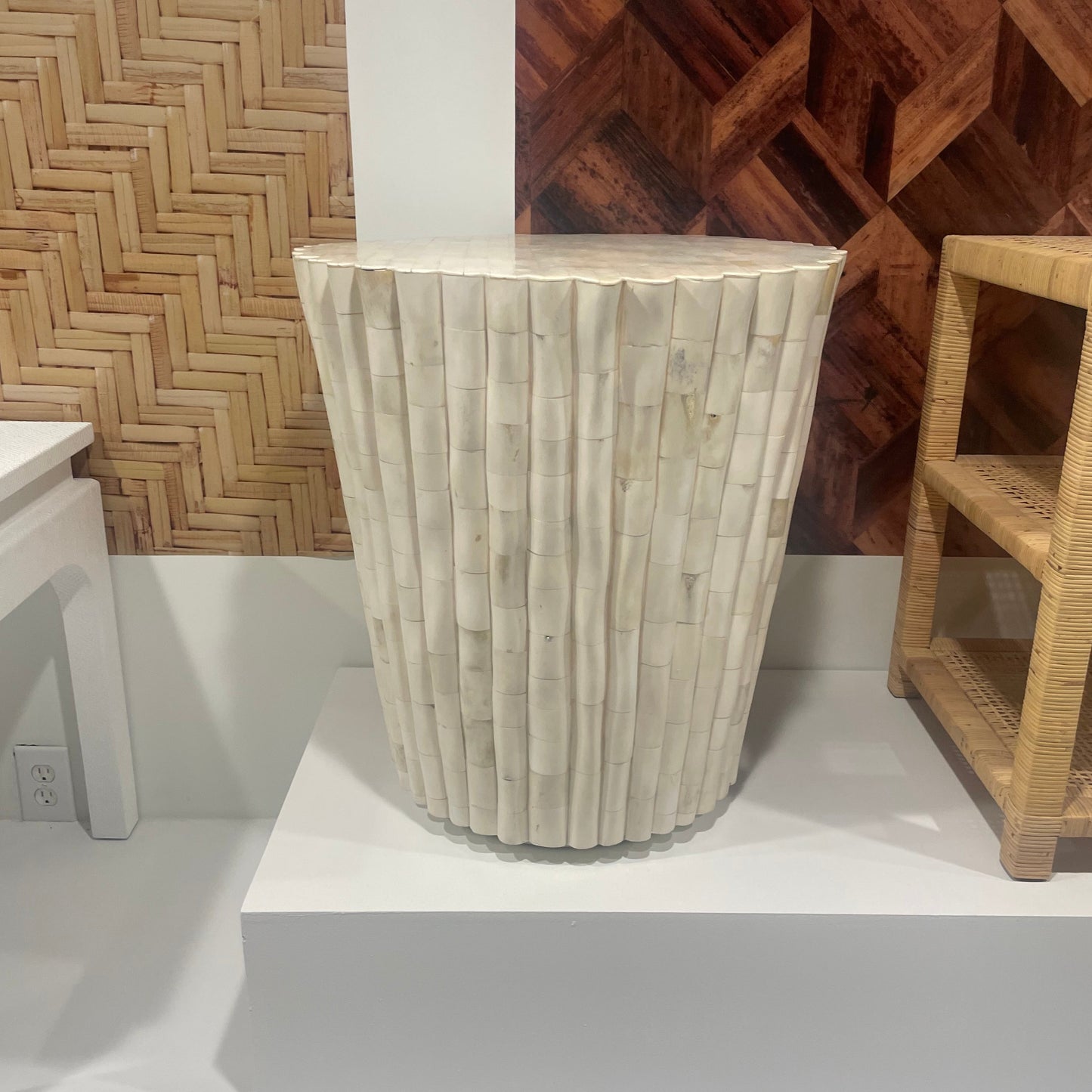 The Hugh Stool in Polished Bone from Made Goods has a tapered shape and rounded design that gives it a feminine touch. The exterior is scalloped, softening its silhouette. Covered entirely in panels of bone, it showcases a natural pattern with varying colors of cream, beige, and warm gray.