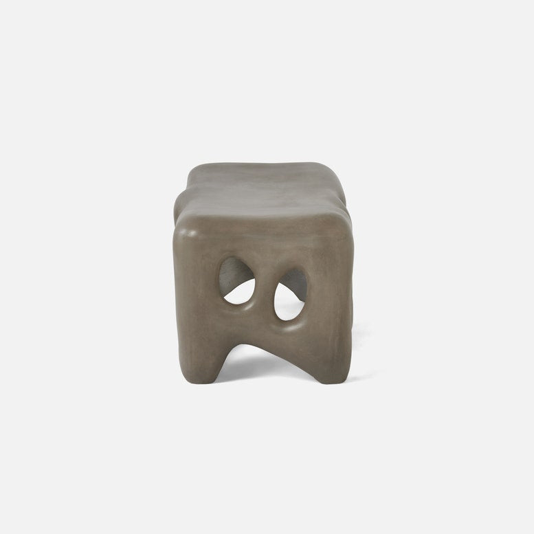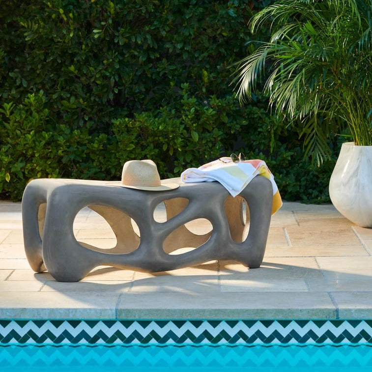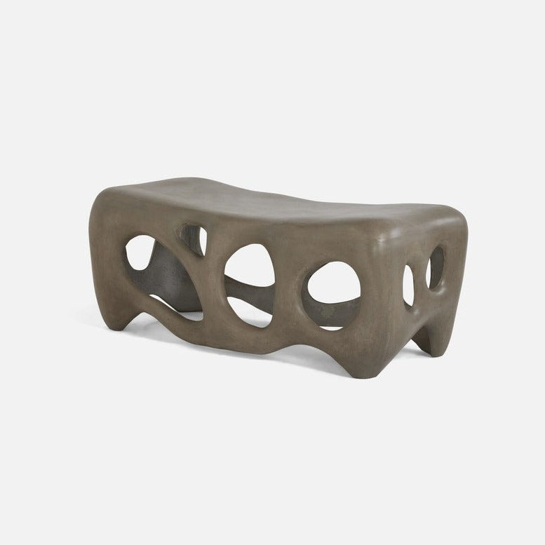 The outdoor Hyde Bench from Made Goods is handmade in gray concrete and features an organic shape and various holes on each side. It is a statement piece that may show natural distressing, minor cracks, and imperfections, and is suitable for freezing temperatures.