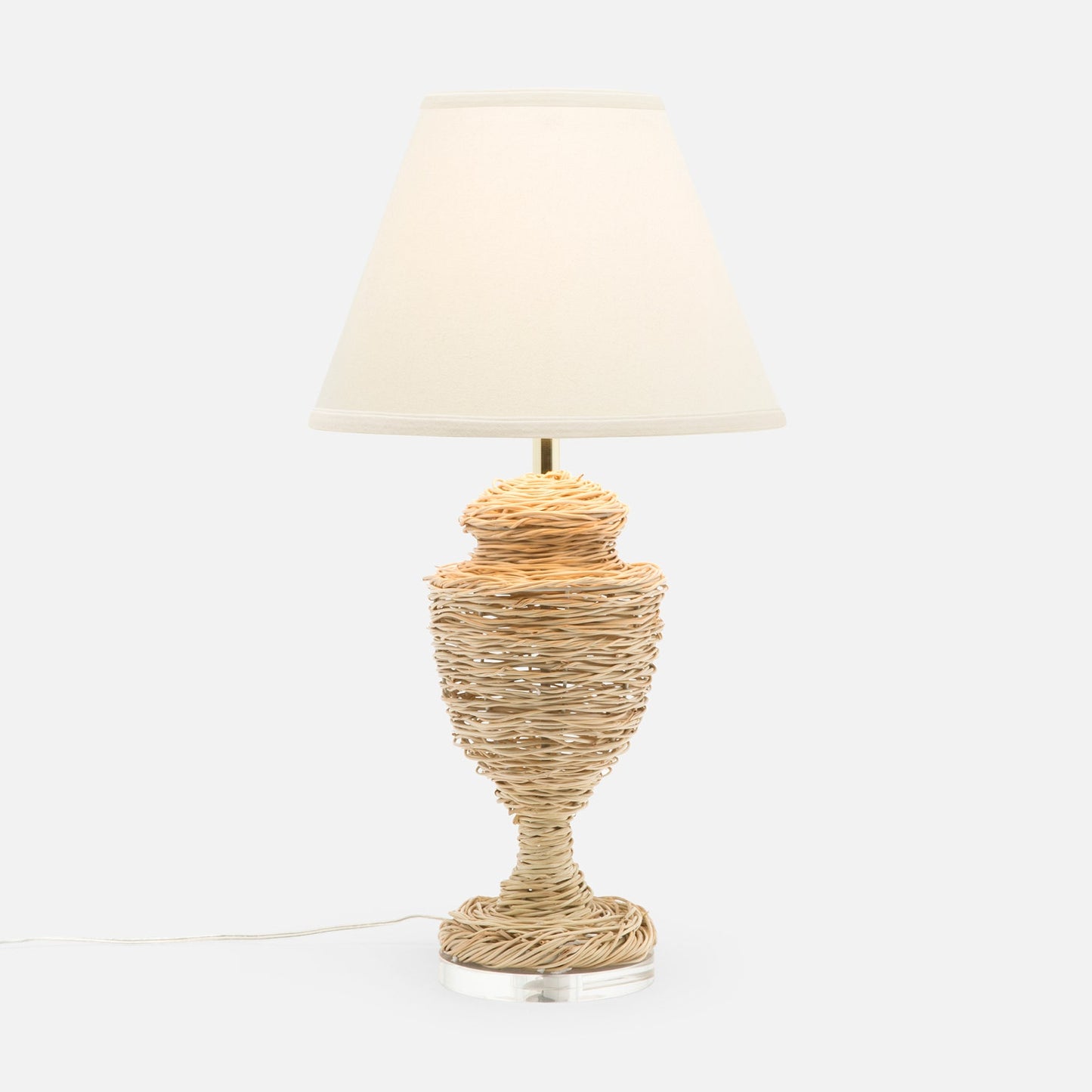 The Ida Lamp from Made Goods features a unique twist on the classic urn shape, with a natural fiber covering and a sturdy crystal base for a relaxed yet modern look. This lamp is perfect for adding a touch of nature to any space.