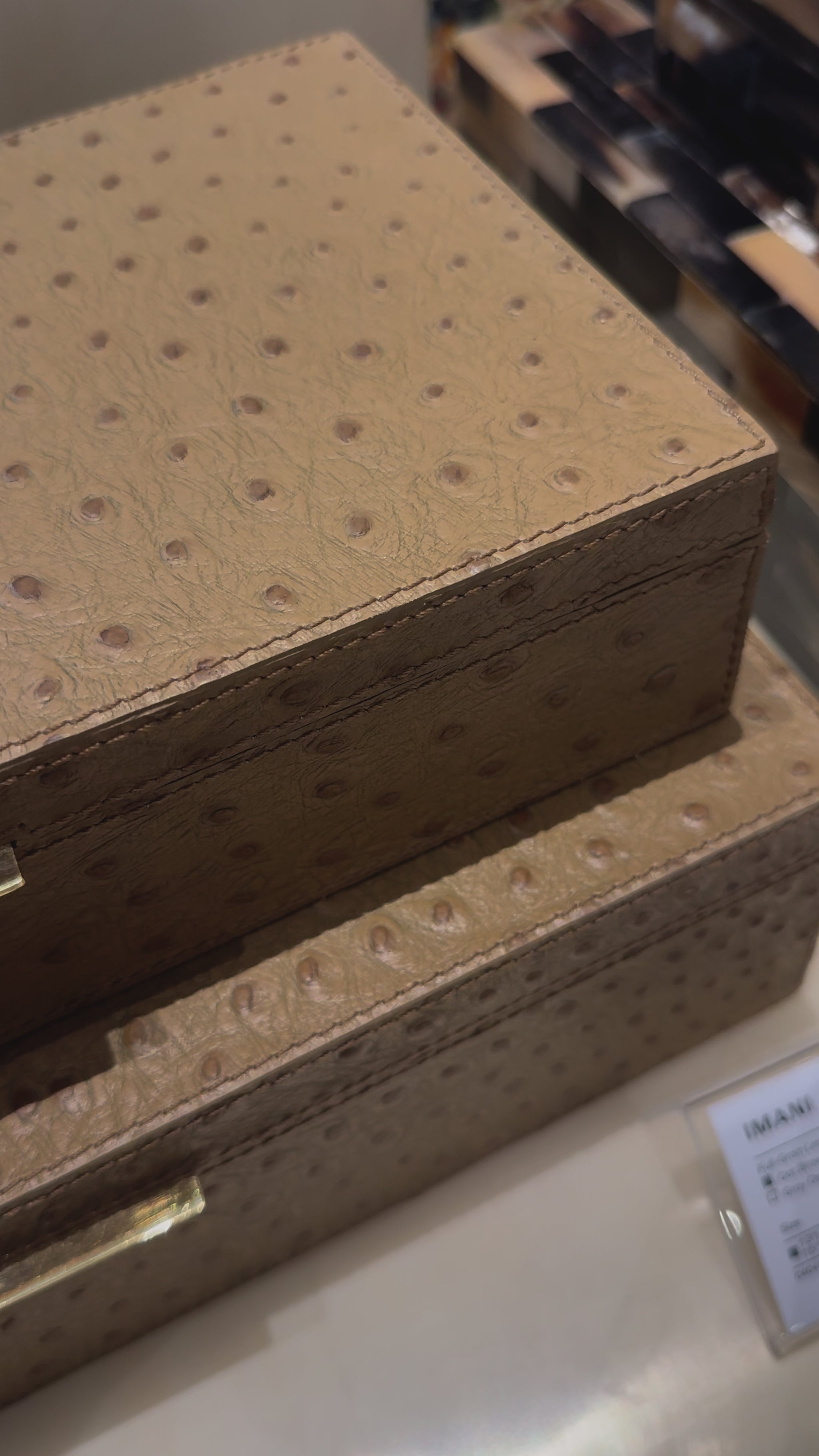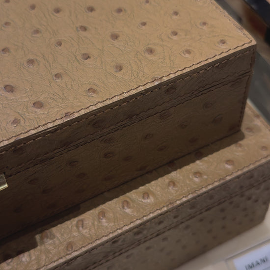 The Imani Box Set from Made Goods is a chic and durable pair of ostrich-embossed leather boxes in Oat Brown, perfect for storing essentials on shelves or tabletops.