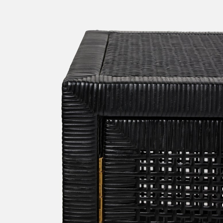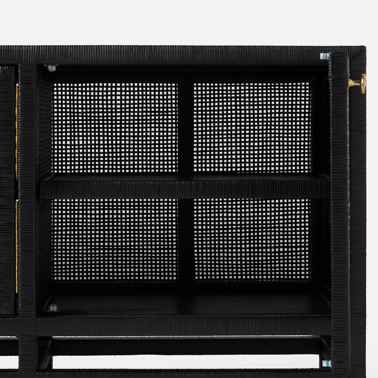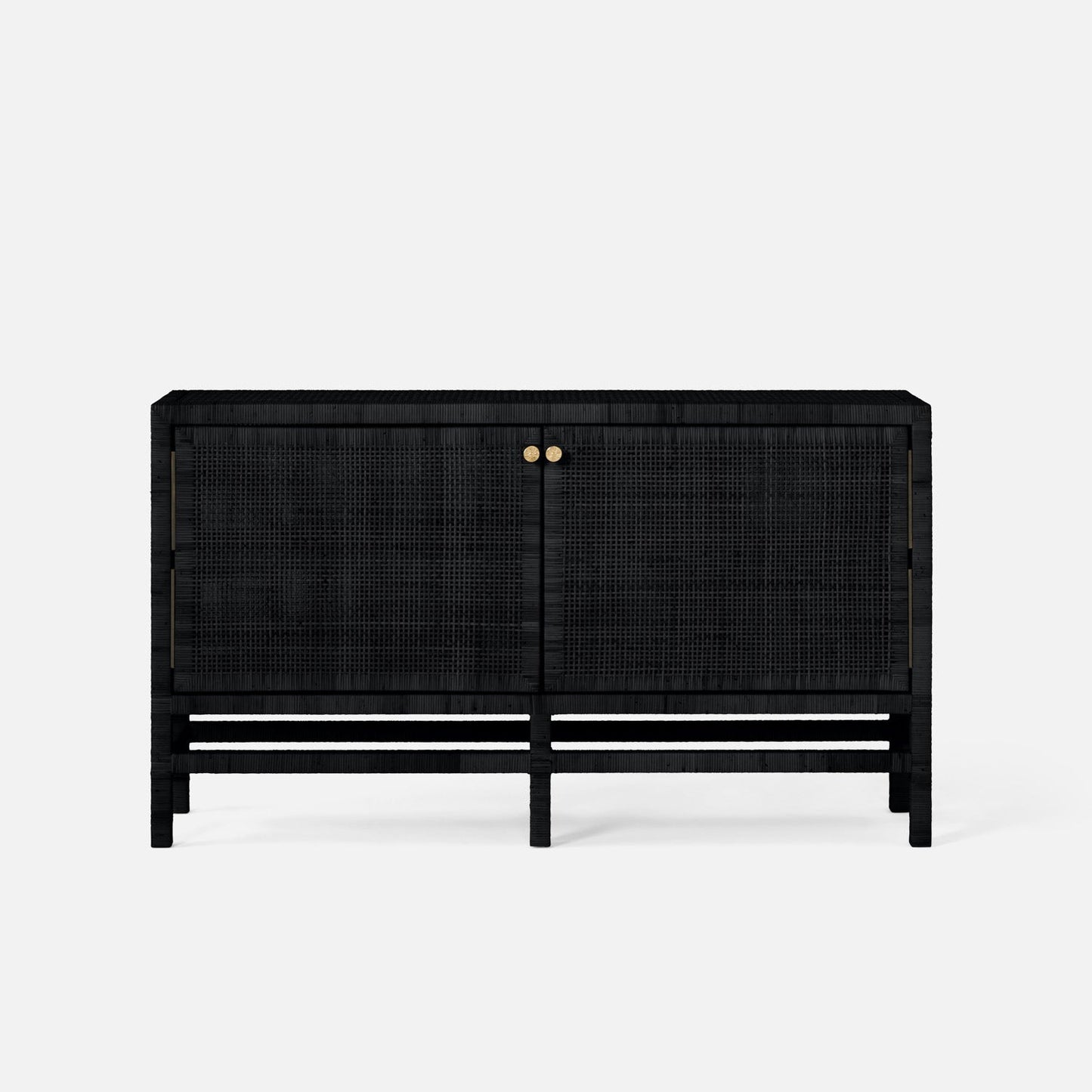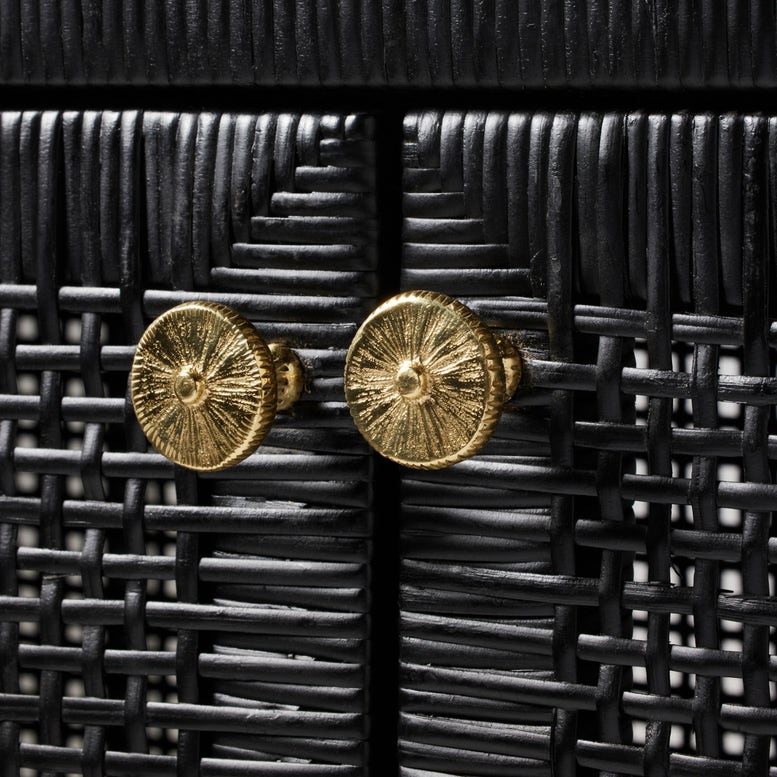 The Isla Buffet from Made Goods features an onyx peeled rattan frame with slender legs and a box stretcher for support. The doors have a dense basket weave while the top has a looser weave, accented by flower-patterned gold knobs.