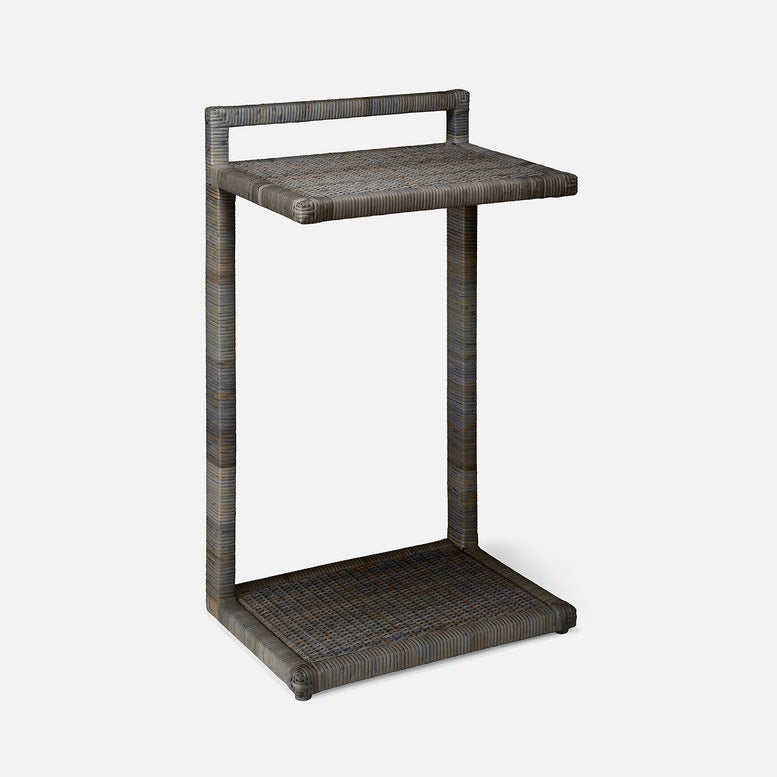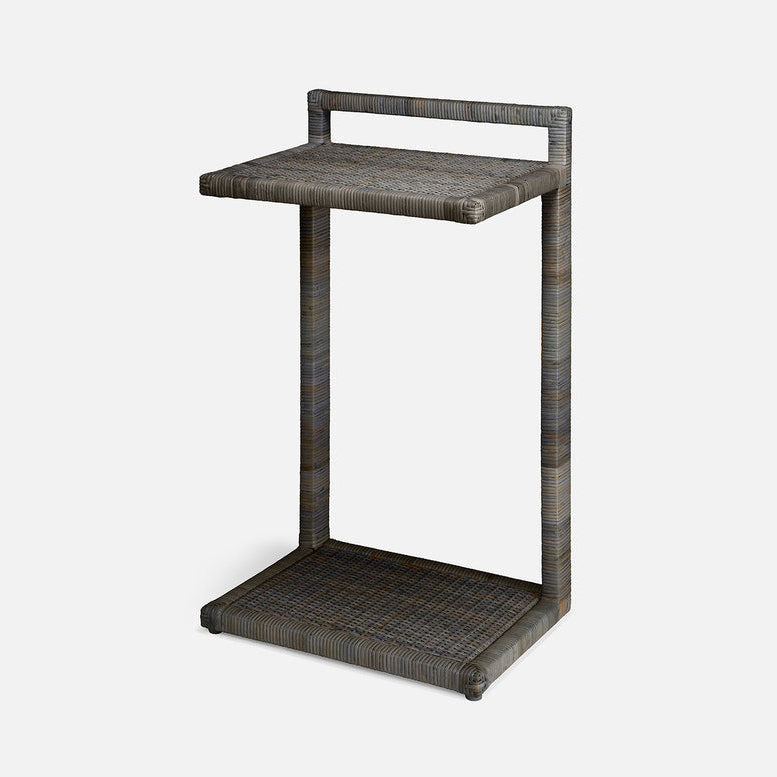 The Isla Laptop Table in Smoke Peeled Rattan has a tightly wrapped, natural peeled rattan frame that complements the dense basket weave of the natural, peeled rattan top, side, and double shelves. The top shelf has a stylish high back and is perfectly positioned for placing a laptop, while the bottom shelf is ideal for storing books or objets d'art.
