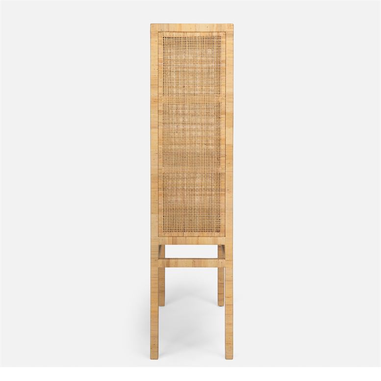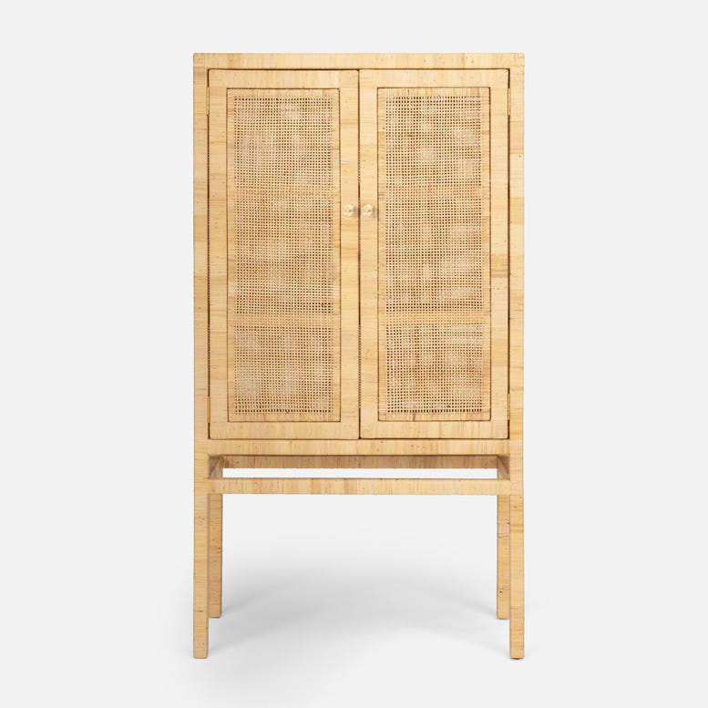 The Isla Standing Cabinet in Natural Peeled Rattan from Made Goods features a tightly wrapped, natural peeled rattan frame that complements the dense basket weave of the natural peeled rattan sides and the slightly looser basket weave of the doors. Four fixed wood shelves, with tightly wrapped natural peeled rattan edges that mirror the cabinet's exterior structure, complete its well-tailored design.