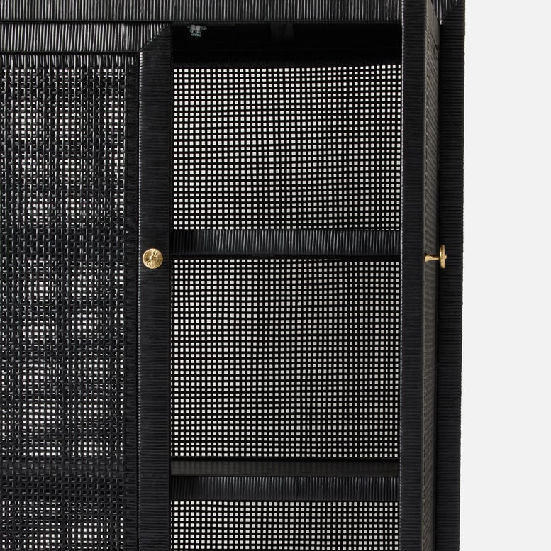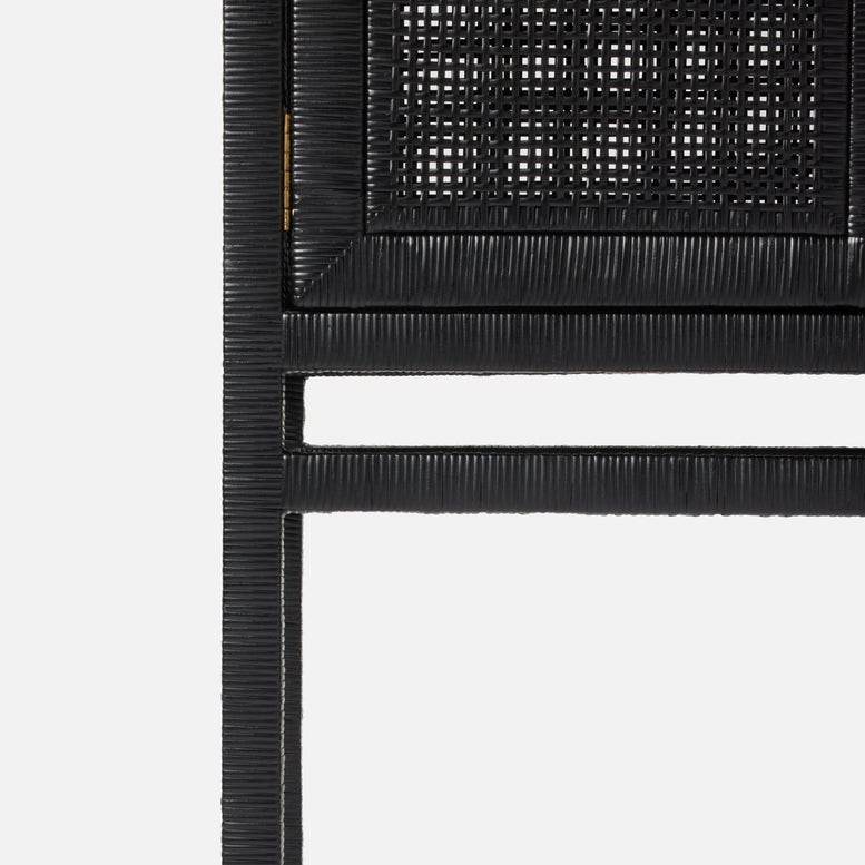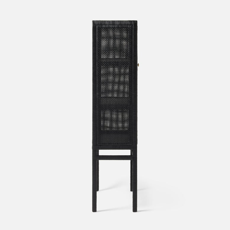 A tightly wrapped, natural peeled rattan frame complements the dense basket weave of the natural peeled rattan sides and the slightly looser basket weave of the doors. The Isla Standing Cabinet in Onyx Peeled Rattan from Made Goods features four fixed wood shelves, with tightly wrapped natural peeled rattan edges that mirror the cabinet's exterior structure, complete its well-tailored design and includes lower-patterned gold knobs.