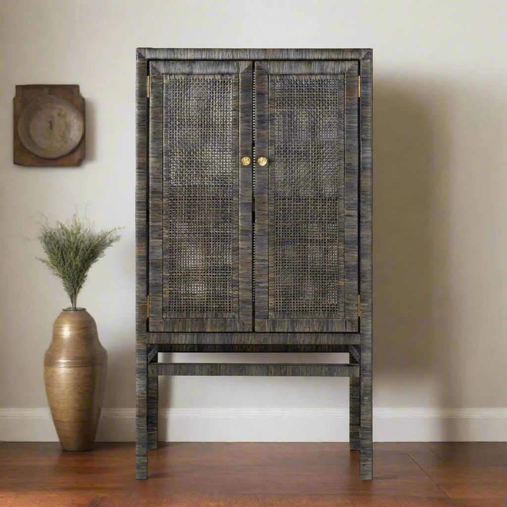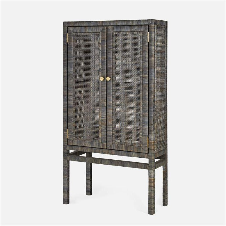 The Isla Standing Cabinet in Smoke Peeled Rattan from Made Goods features a tightly wrapped, smoke peeled rattan frame that complements the dense basket weave of the smoke peeled rattan sides and the slightly looser basket weave of the doors. Four fixed wood shelves, with tightly wrapped natural peeled rattan edges that mirror the cabinet's exterior structure, complete its well-tailored design.