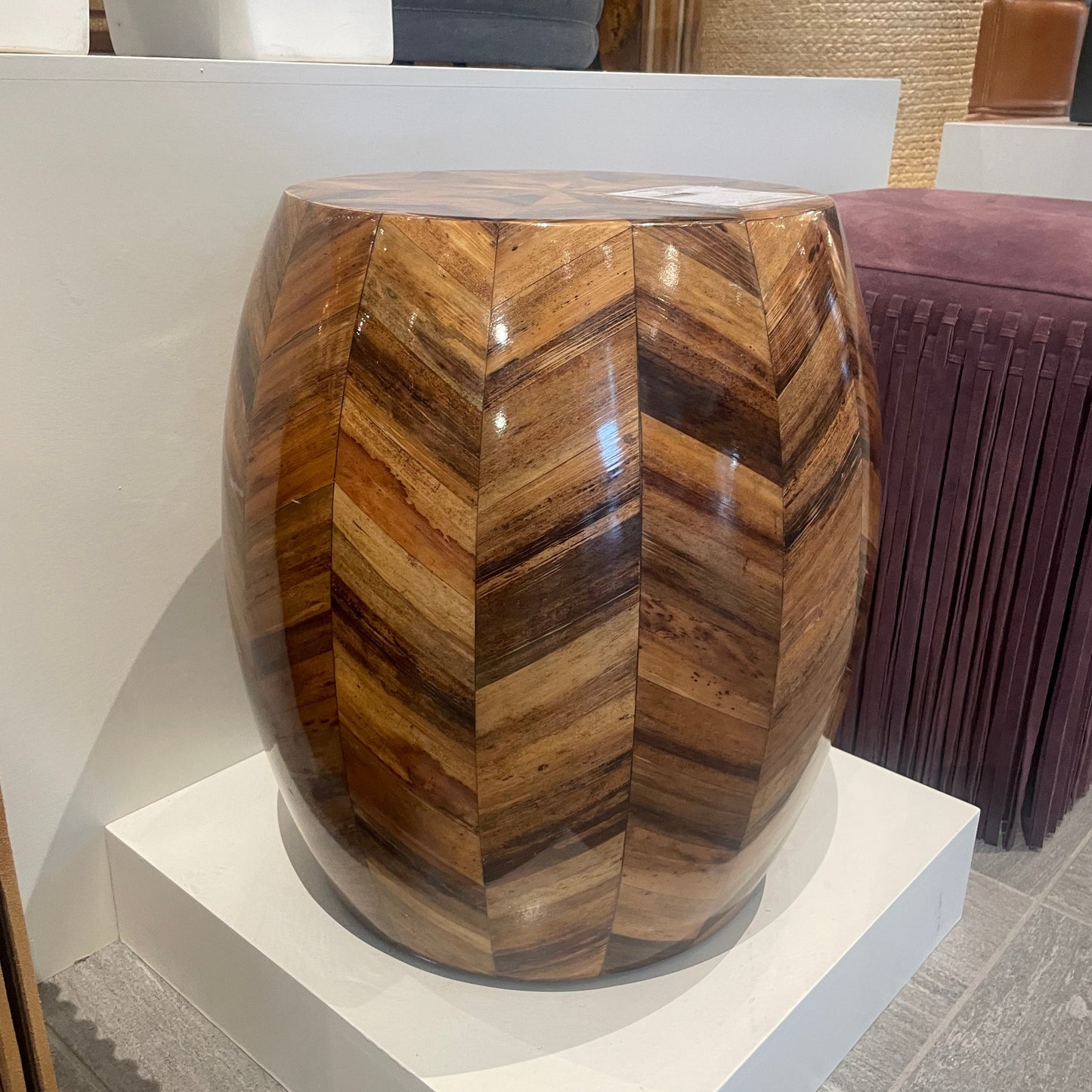 Made Goods Jada Stool in Natural Banana Bark reflects a starburst aesthetic on top and a chevron design around its sides. Garden stools like the unique Jada can also serve as a small side table when needed.
