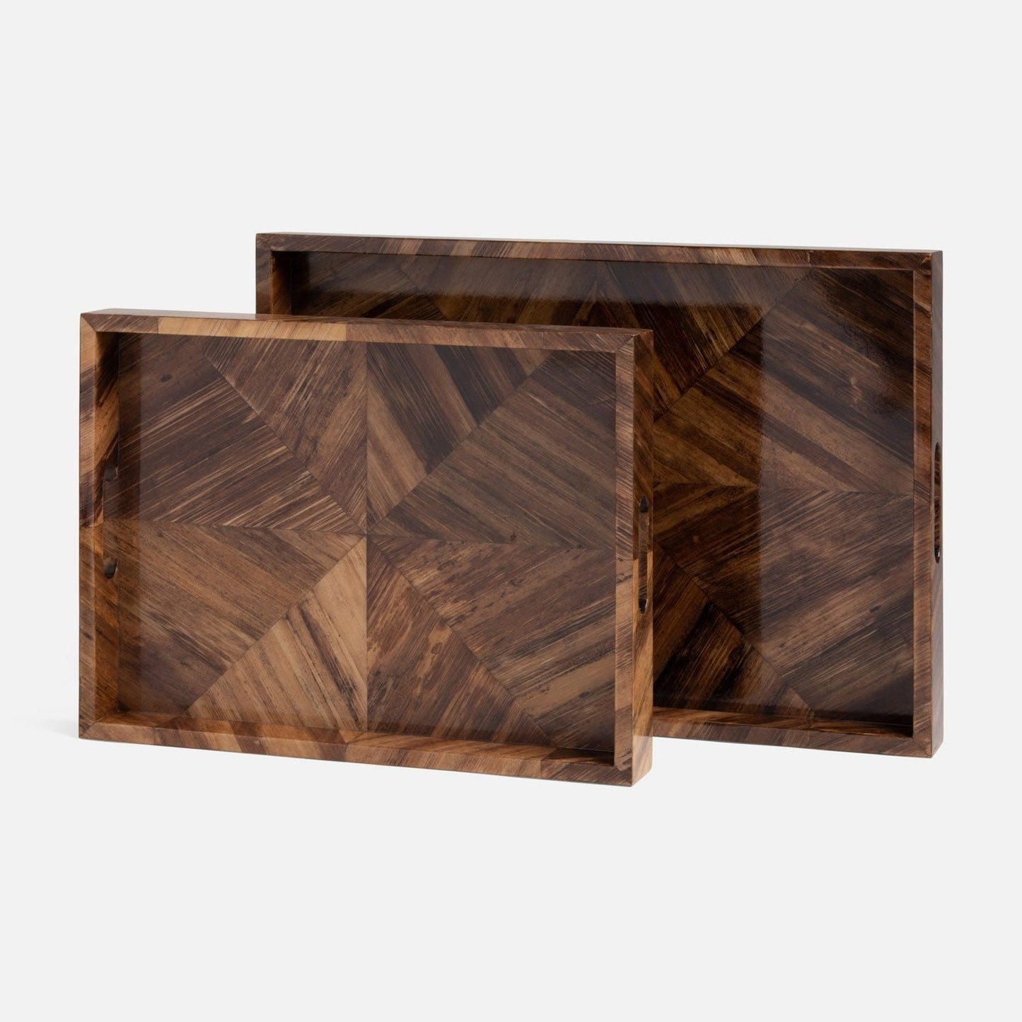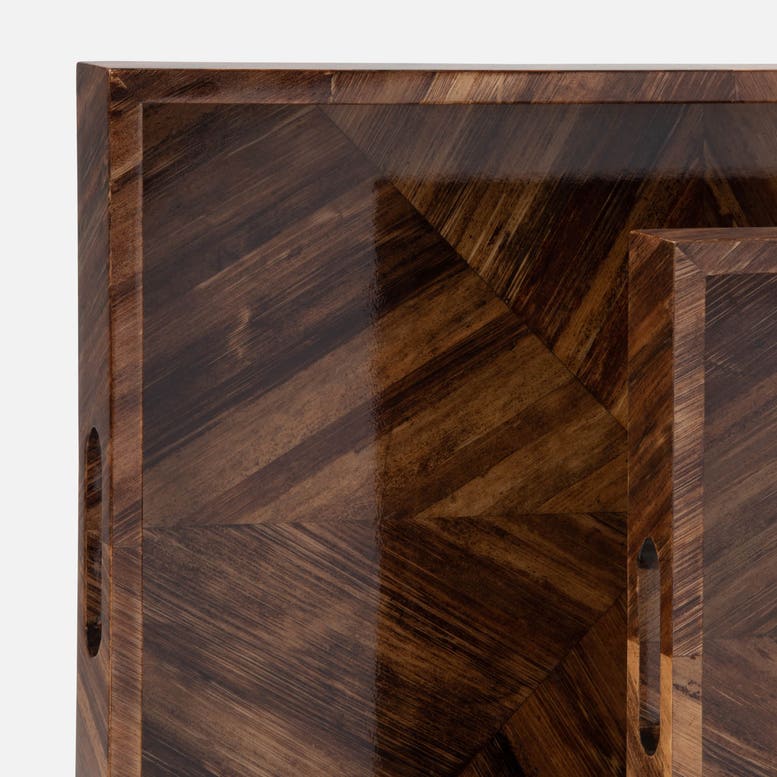 The Jada Tray Set in Natural Banana Bark from Made Goods features a dazzling design with its hand-laid pieces of sustainable banana bark. These eye-catching rectangular trays gives a nod to the '70s without being retro.