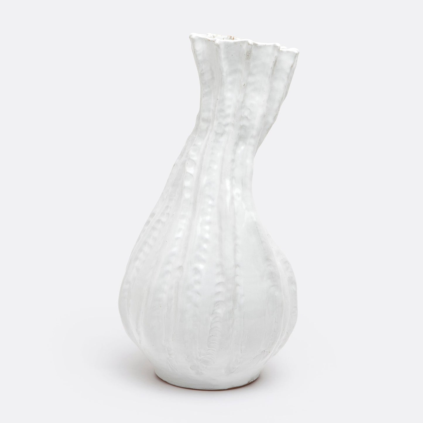 The Janus Vase from Made Goods features a textured, gourd-like shape that evokes movement. This tall handmade and glazed ceramic vase is lovely placed individually or in a grouping for a more dramatic presentation on tabletops, shelving, and desktops alike.