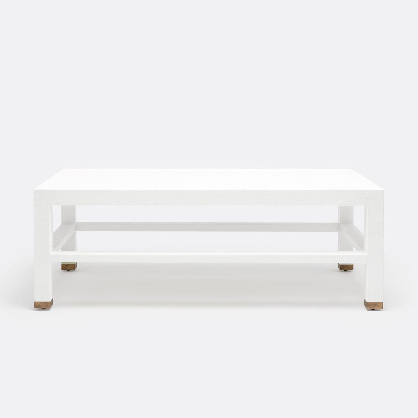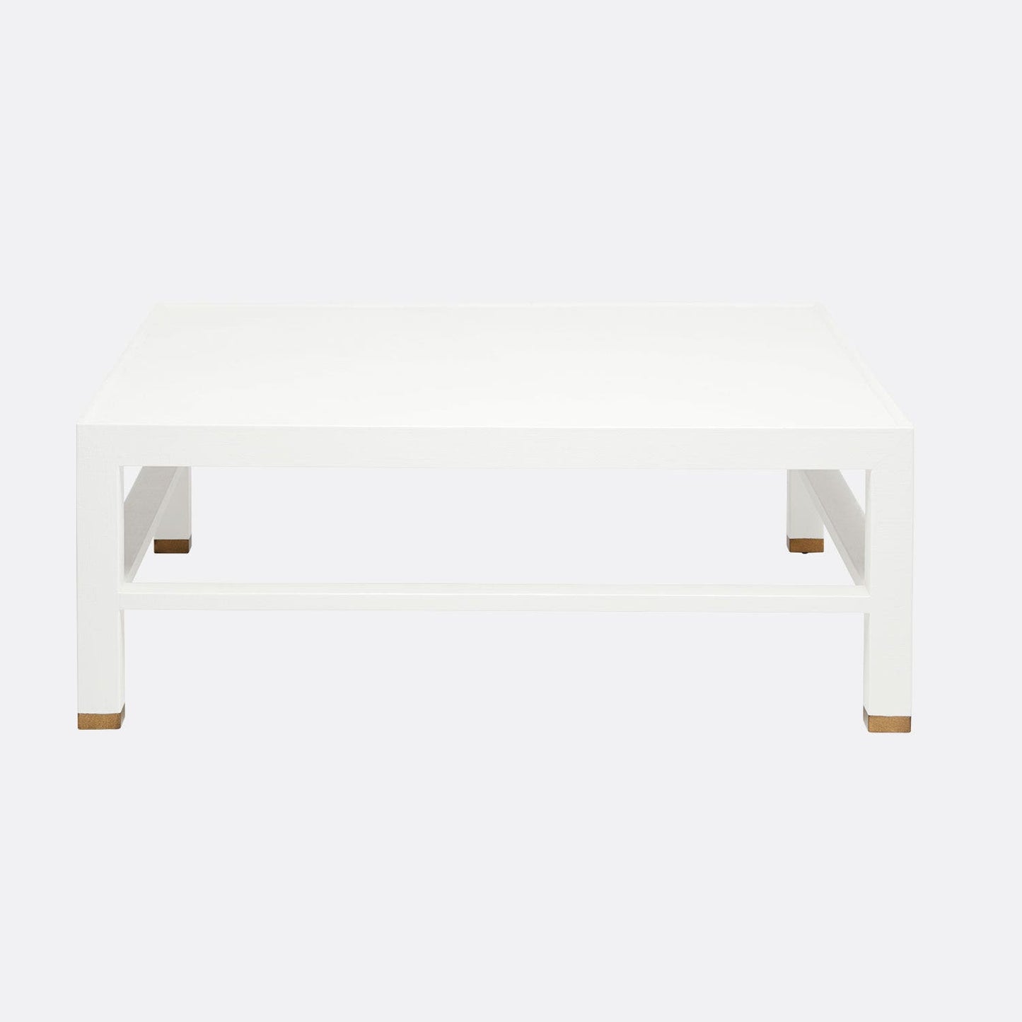 Elevate your space with The Jarin Coffee Table in Designer White Faux Belgian Linen from Made Goods. The substantial Jarin is fully finished in designer white faux Belgian linen, highlighting the material's texture and sheen with a simple shape. A great lip element around the top surface is only one of the piece's many considered details.