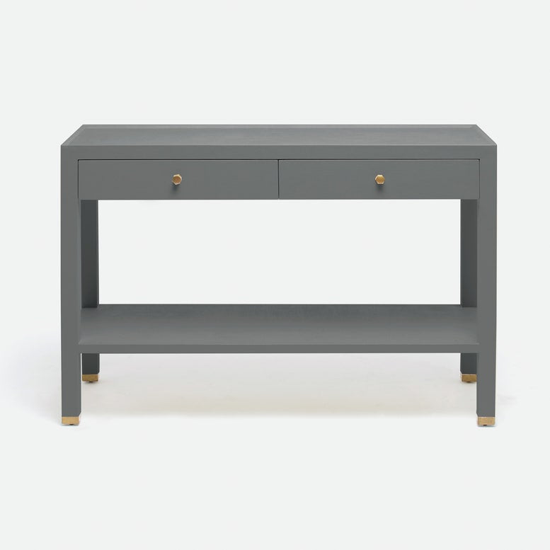 The Jarin Console in Graphite Faux Belgian Linen from Made Goods features a traditional shape with a subtle lip top. The two drawer storage is fabulous for keeping things organized. The open bottom shelf can be left as is or used to display objects of interest.