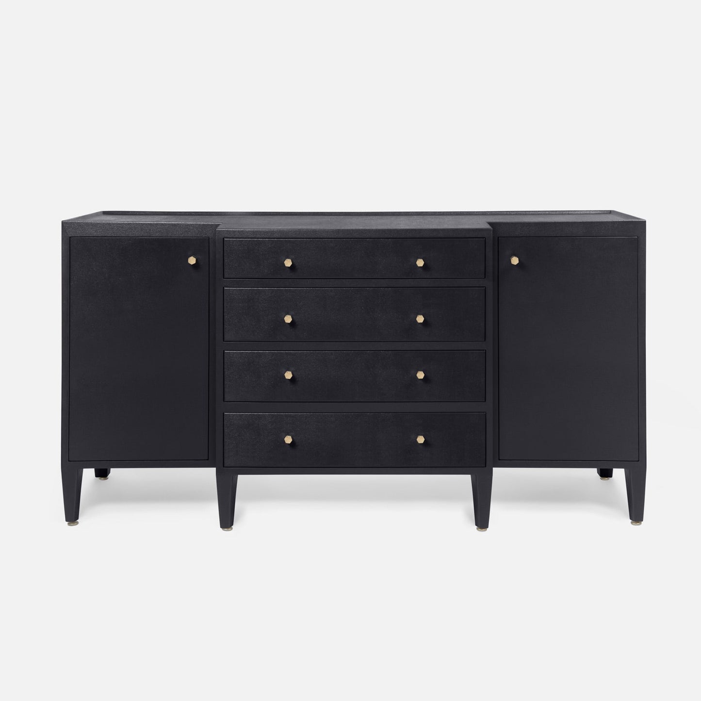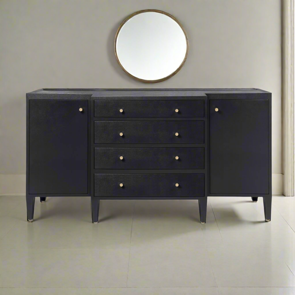 The Jarin Deep Drawer Buffet is made from luxurious dark navy faux Belgian linen and offers ample storage space. The textured finish, bottom-mount European glides, and lipped detail add to its elegant design. Simple brass knobs complete the luxurious look, while the easy-open glides keep your items organized and secure.