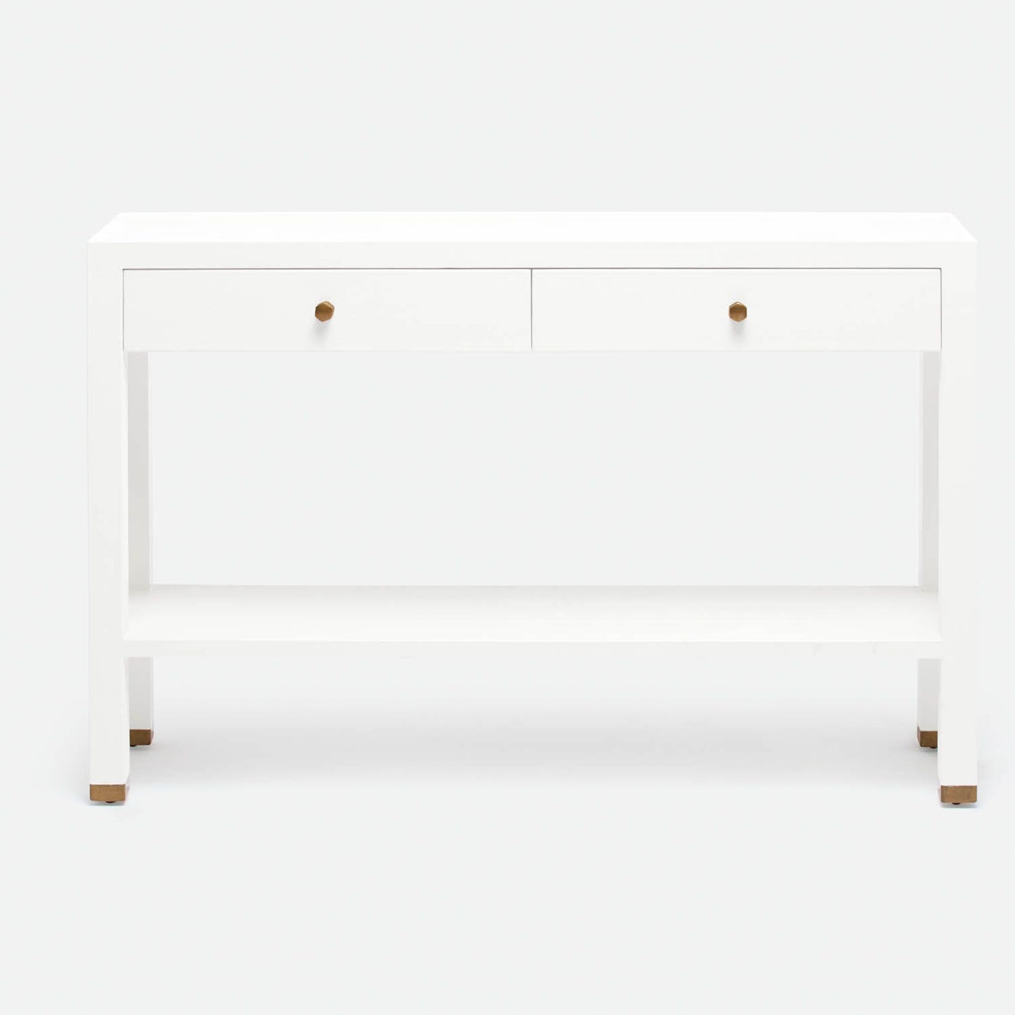 The Jarin Console in Designer White Faux Belgian Linen from Made Goods features a traditional shape with a subtle lip top. The two drawer storage is fabulous for keeping things organized. The open bottom shelf can be left as is or used to display objects of interest.